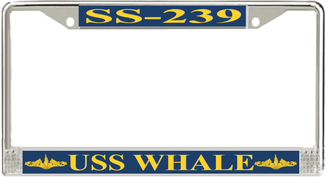 USS Whale SS-239 License Plate Frame This USS Whale SS-239 License Plate Frame is proudly made in the USA at our facilities in Scottsboro, Alabama. Each Frame features top and bottom sublimated design strips that are poly coated for a protective gloss finish. Please check your state and local regulations for compatibility of these frames for use on your vehicle.