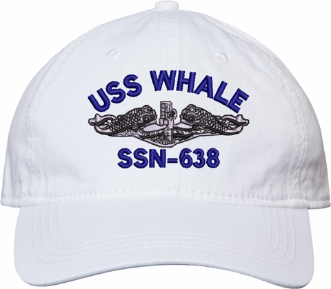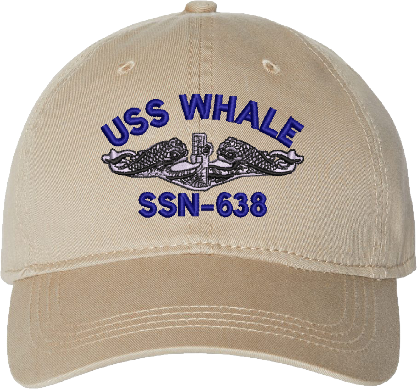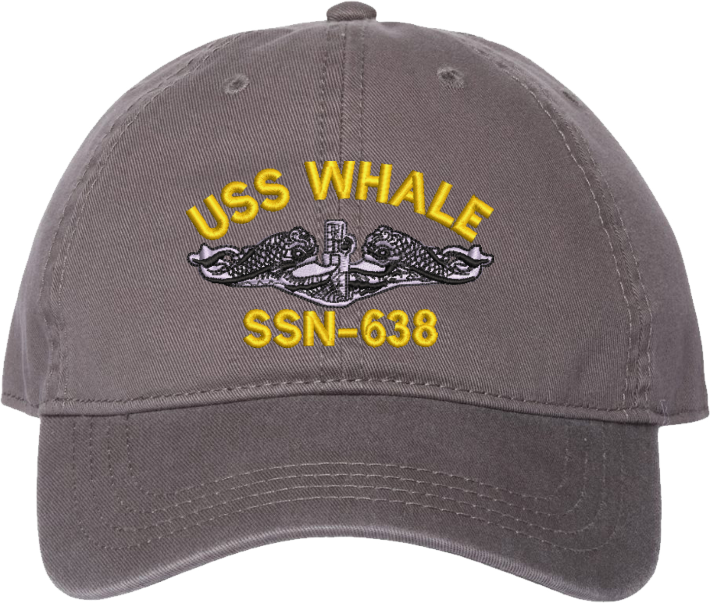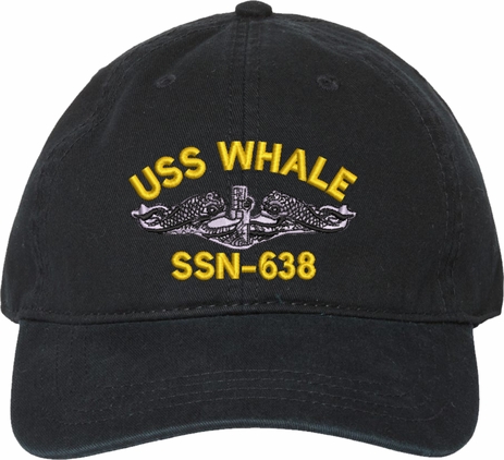 Show your Navy pride with this USS Whale SSN-638 with Dolphins Unstructured Dad Cap from MilitaryBest. Crafted from 100% washed chino twill cotton, this six-panel, low-profile cap offers a relaxed and comfortable fit. Featuring high-quality embroidery done in our Scottsboro, Alabama facility, this cap is designed with a pre-curved visor and an adjustable tri-glide buckle closure for a perfect fit. Whether for everyday wear or as a meaningful gift, this cap is a great way to honor your own or a loved one's service.For caps ordered with custom embroidered personalized text please allow an additional 3 to 5 days production time. All custom back text will be embroidered in ALL CAPITAL LETTERS. Caps with back text or eggs are non-returnable unless there is a material defect in the cap.