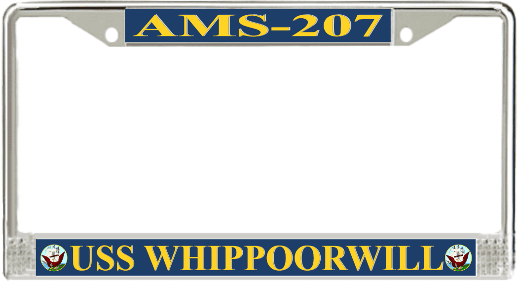 USS Whippoorwill AMS-207 License Plate Frame This USS Whippoorwill AMS-207 License Plate Frame is proudly made in the USA at our facilities in Scottsboro, Alabama. Each Frame features top and bottom sublimated design strips that are poly coated for a protective gloss finish. Please check your state and local regulations for compatibility of these frames for use on your vehicle.