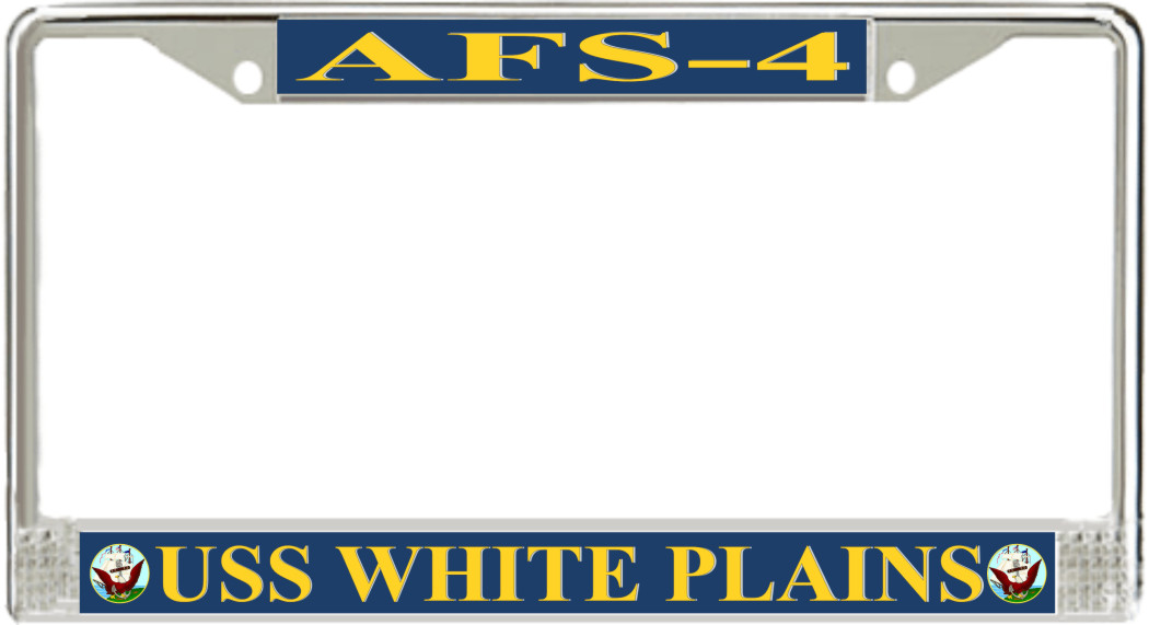 USS White Plains AFS-4 License Plate FrameThis USS White Plains AFS-4 License Plate Frame is proudly made in the USA at our facilities in Scottsboro, Alabama. Each of our MilitaryBest U.S. Navy Frames feature top and bottom Poly Coated Aluminum strips that are printed using sublimation which gives these quality automobile military frames a beautiful high gloss finish.