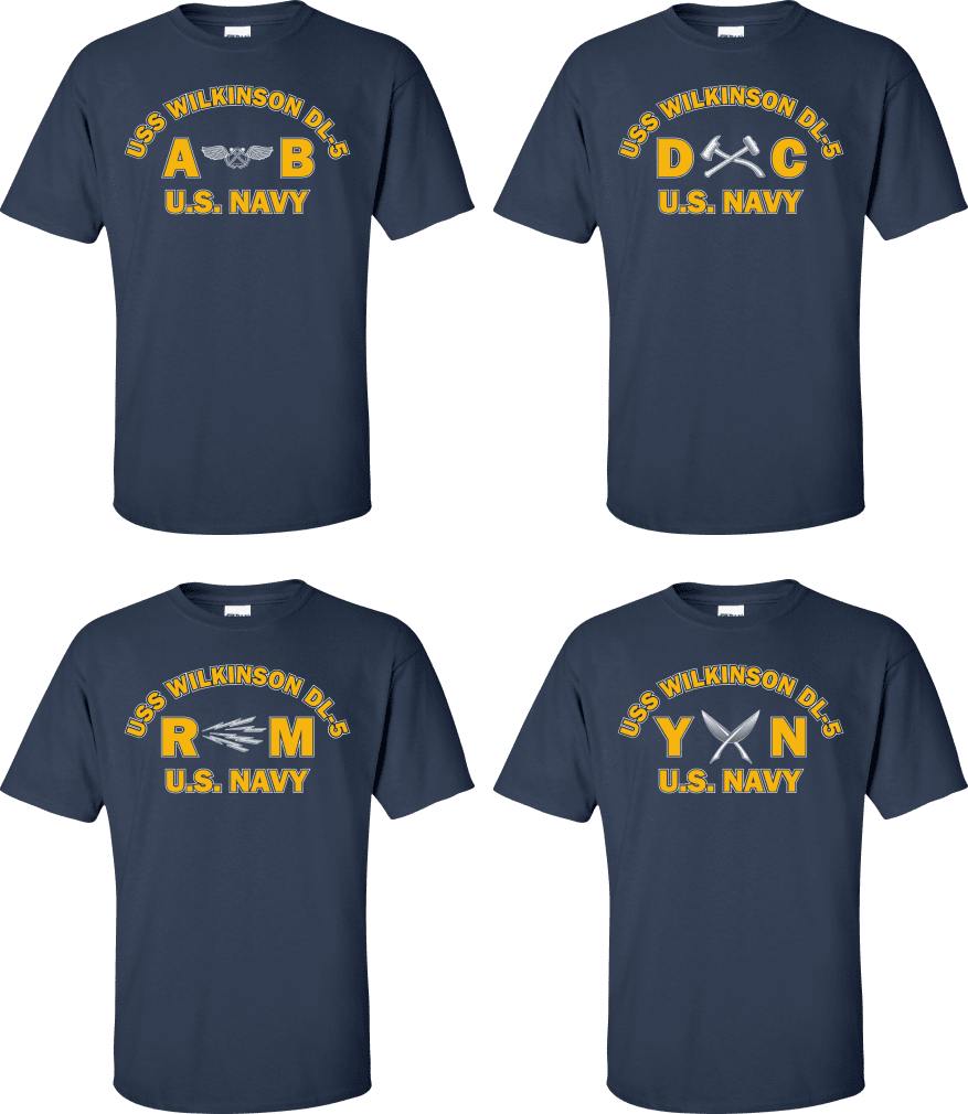 Due to disruptions in supply chains, this design will be embroidered on a Champion, Gildan, Jerzees or comparable brand.Proudly display your ship and rate with our top quality USS WILKINSON DL-5 Rates t-shirts, sweatshirts, and hoodies. These fine U.S. Navy apparel items will make you the envy of your veteran buddies, or will make a fine gift! Our USS WILKINSON DL-5 shirts are proudly printed in the USA!