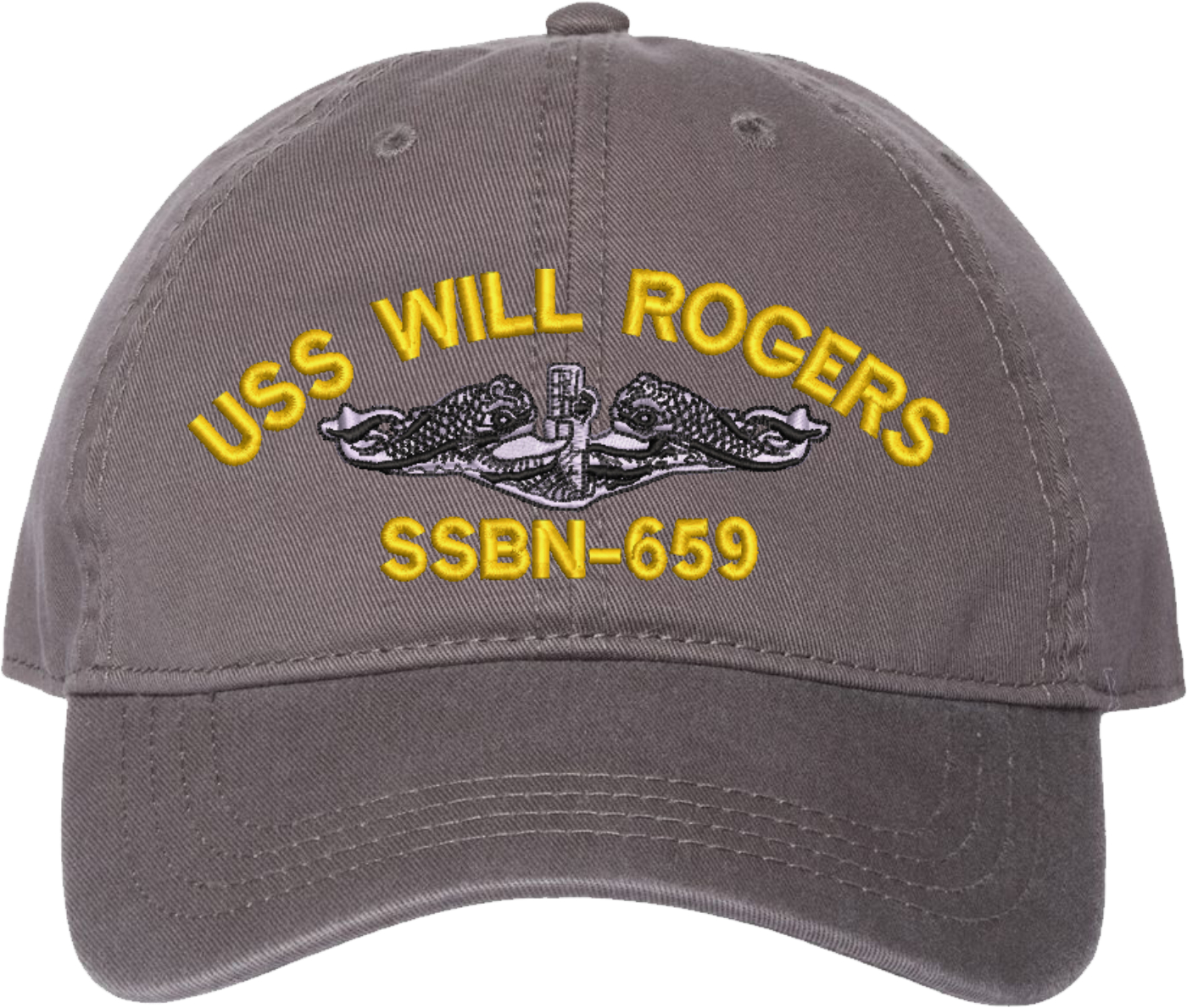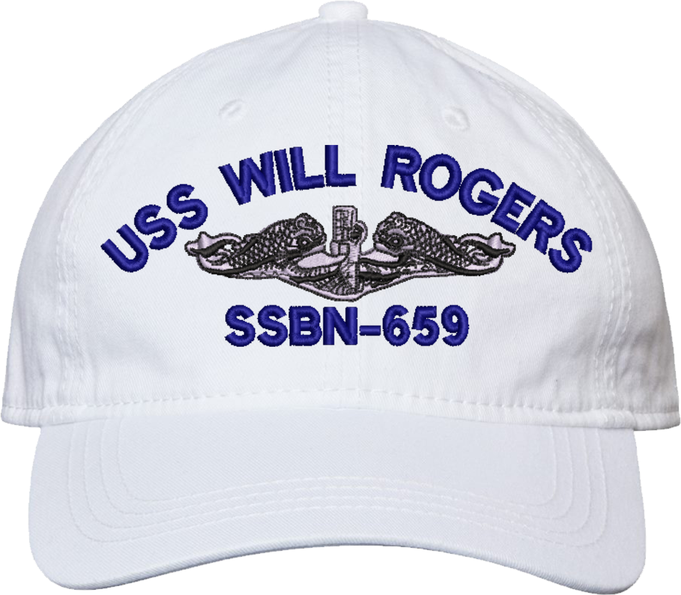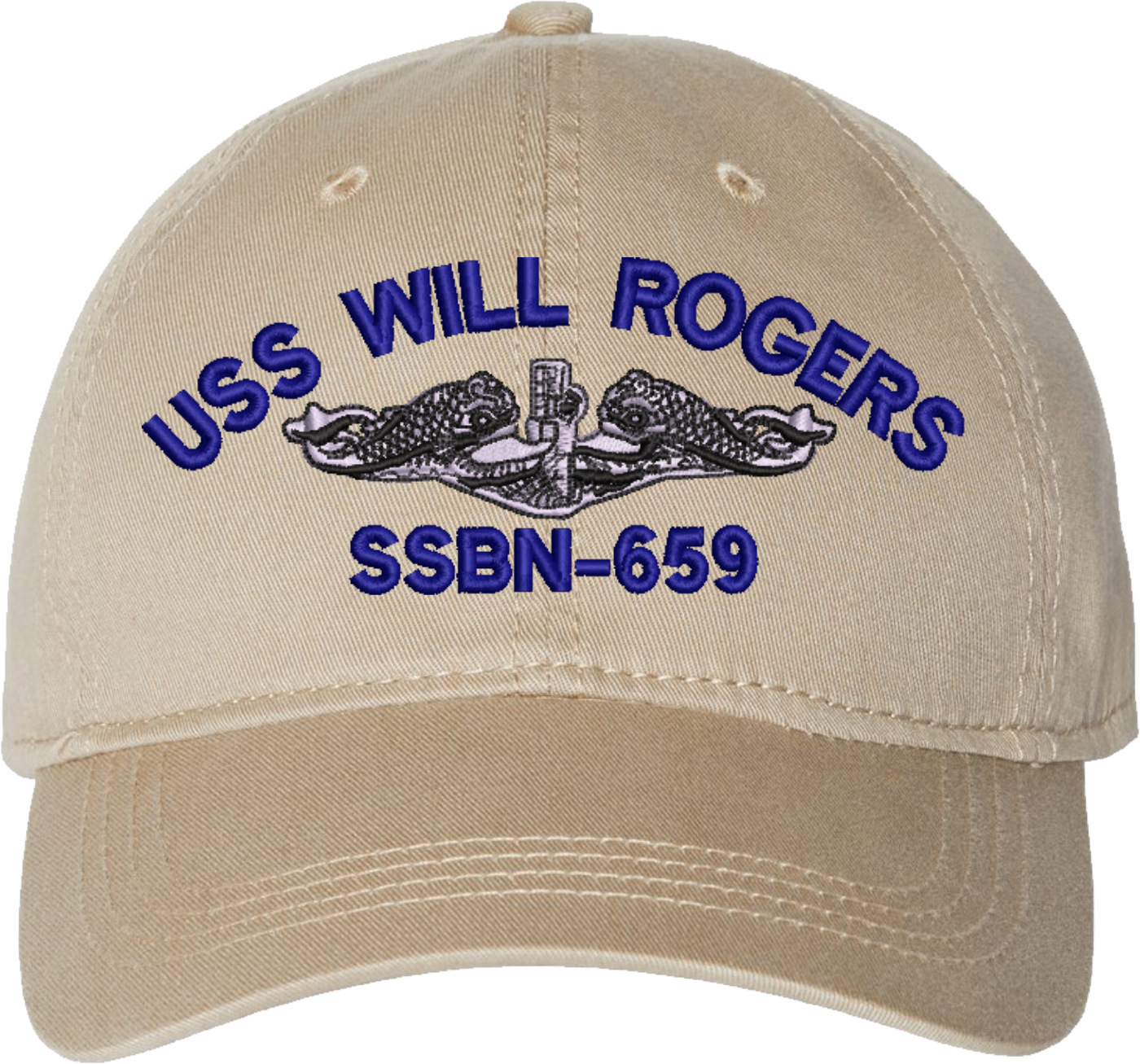 Show your Navy pride with this USS Will Rogers SSBN-659 with Dolphins Unstructured Dad Cap from MilitaryBest. Crafted from 100% washed chino twill cotton, this six-panel, low-profile cap offers a relaxed and comfortable fit. Featuring high-quality embroidery done in our Scottsboro, Alabama facility, this cap is designed with a pre-curved visor and an adjustable tri-glide buckle closure for a perfect fit. Whether for everyday wear or as a meaningful gift, this cap is a great way to honor your own or a loved one's service.For caps ordered with custom embroidered personalized text please allow an additional 3 to 5 days production time. All custom back text will be embroidered in ALL CAPITAL LETTERS. Caps with back text or eggs are non-returnable unless there is a material defect in the cap.