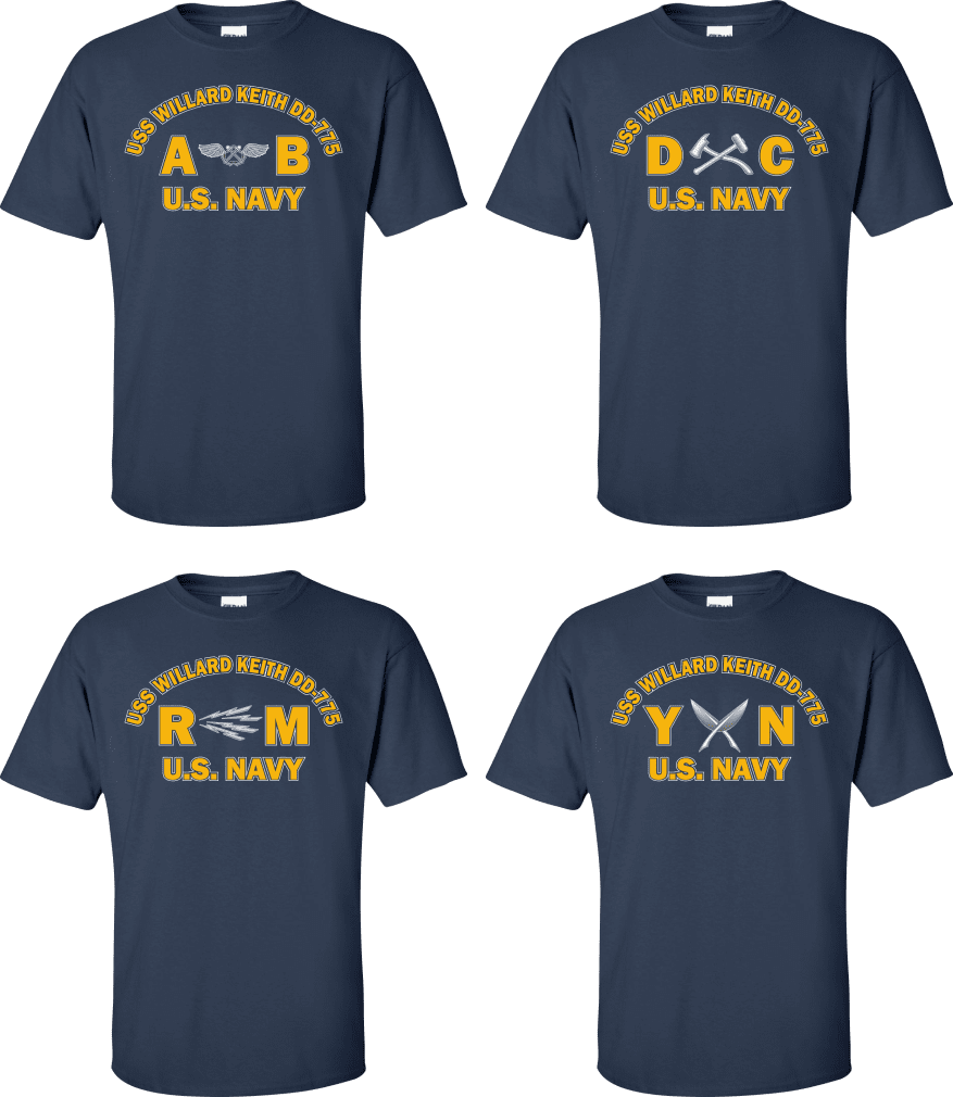 Due to disruptions in supply chains, this design will be embroidered on a Champion, Gildan, Jerzees or comparable brand.Proudly display your ship and rate with our top quality USS WILLARD KEITH DD-775 Rates t-shirts, sweatshirts, and hoodies. These fine U.S. Navy apparel items will make you the envy of your veteran buddies, or will make a fine gift! Our USS WILLARD KEITH DD-775 shirts are proudly printed in the USA!