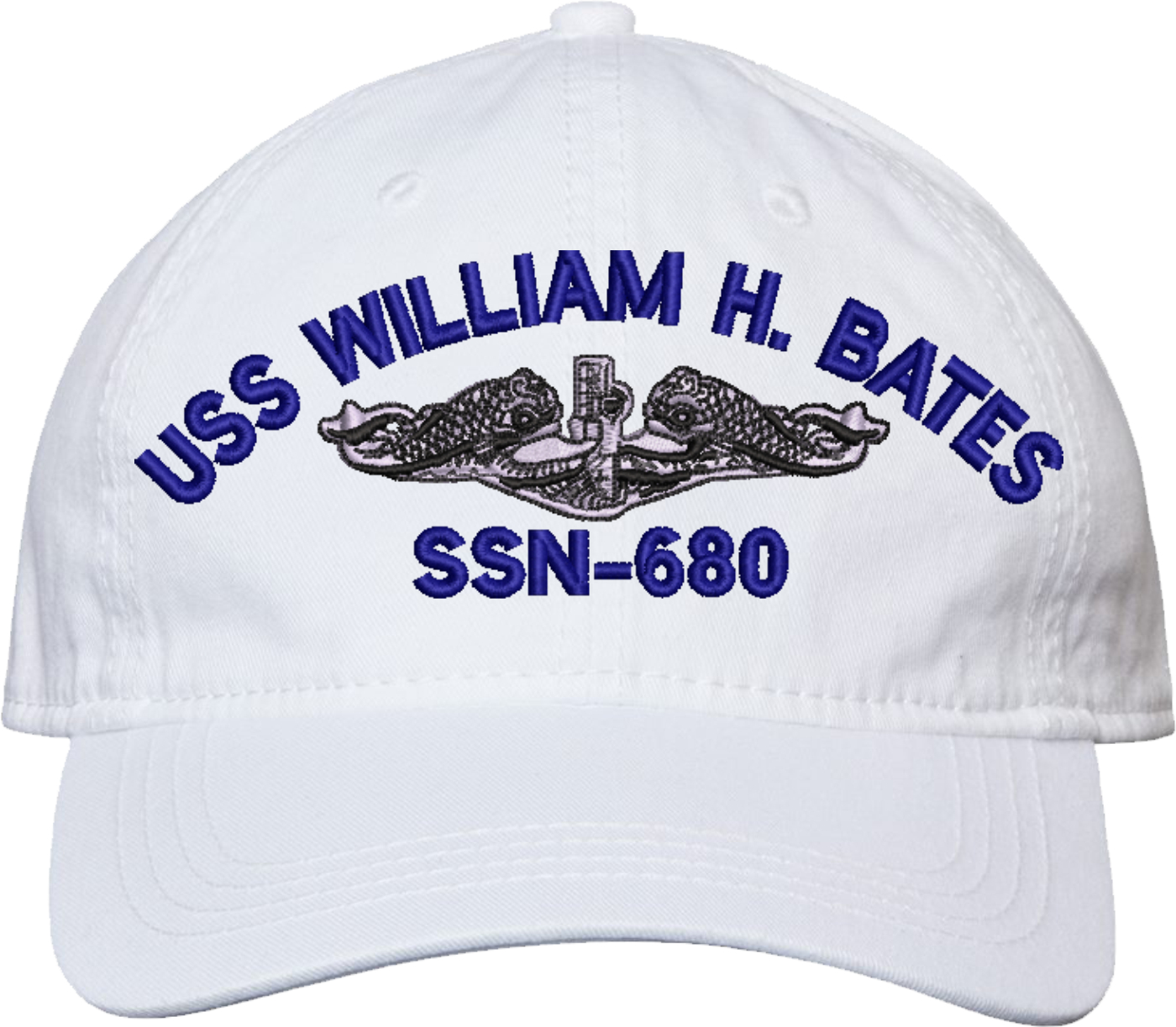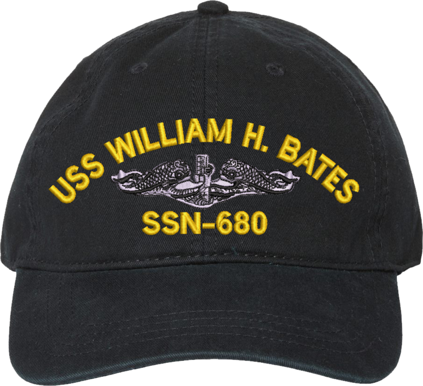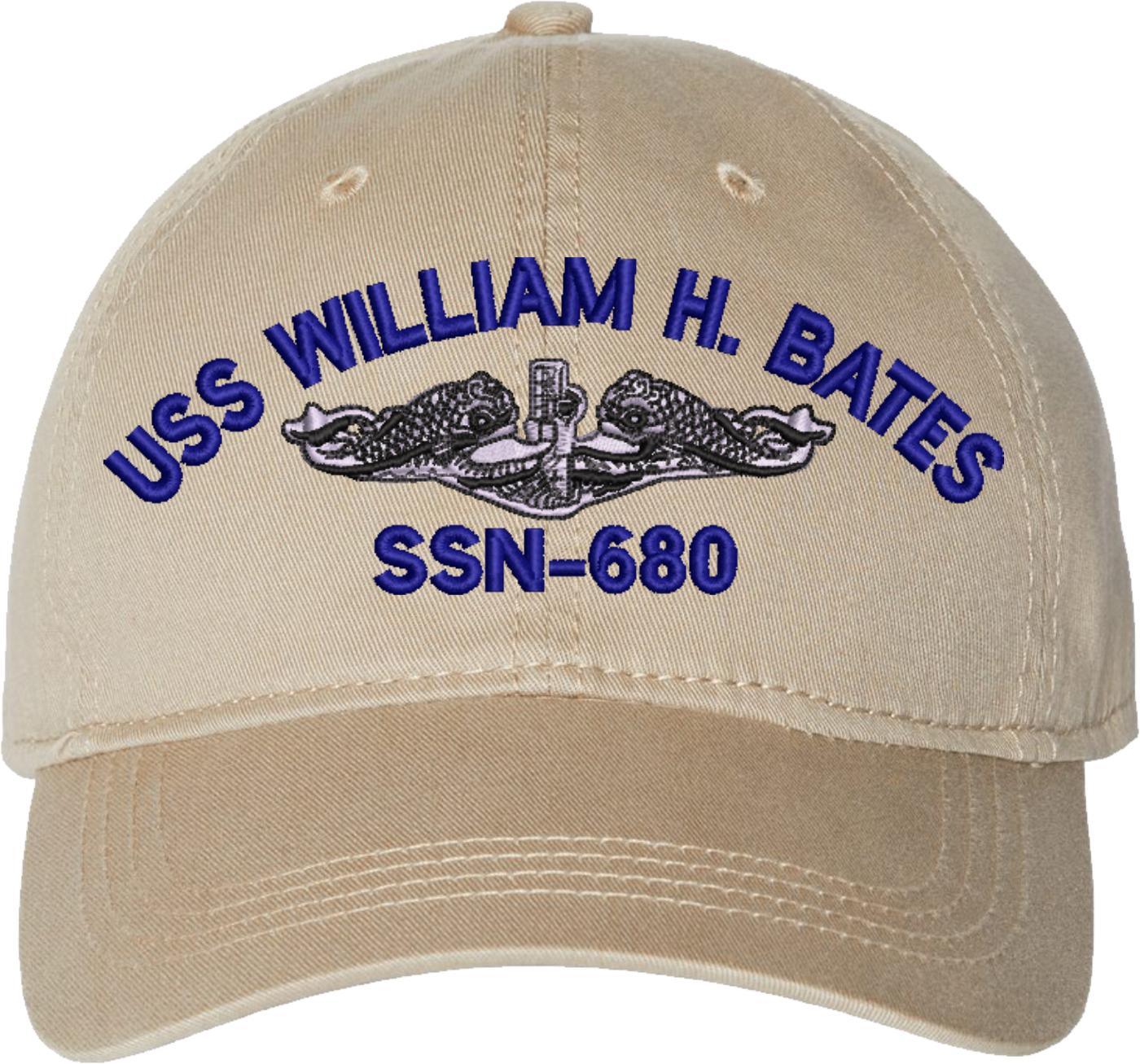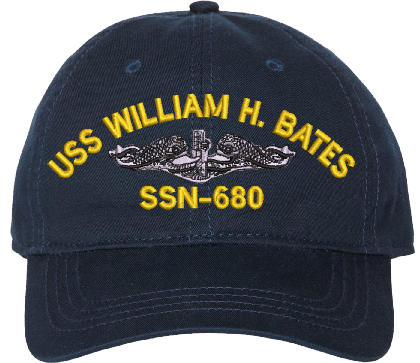 Show your Navy pride with this USS William H Bates SSN-680 with Dolphins Unstructured Dad Cap from MilitaryBest. Crafted from 100% washed chino twill cotton, this six-panel, low-profile cap offers a relaxed and comfortable fit. Featuring high-quality embroidery done in our Scottsboro, Alabama facility, this cap is designed with a pre-curved visor and an adjustable tri-glide buckle closure for a perfect fit. Whether for everyday wear or as a meaningful gift, this cap is a great way to honor your own or a loved one's service.For caps ordered with custom embroidered personalized text please allow an additional 3 to 5 days production time. All custom back text will be embroidered in ALL CAPITAL LETTERS. Caps with back text or eggs are non-returnable unless there is a material defect in the cap.