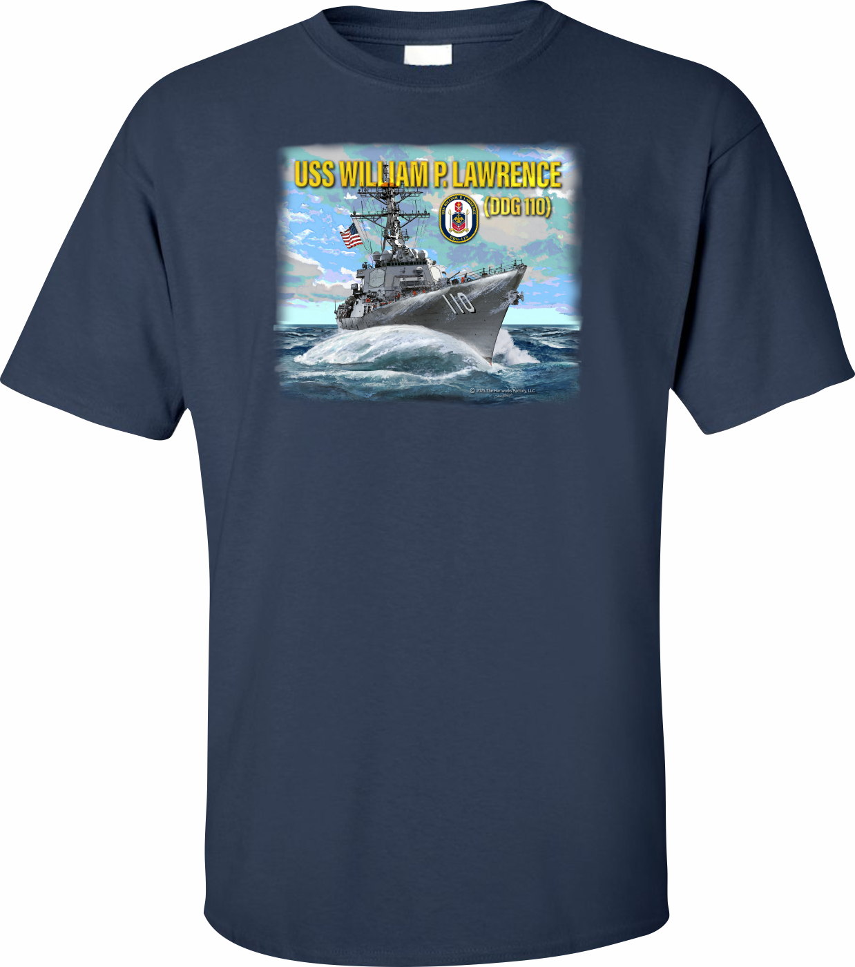 MilitaryBest is proud to offer this fine USS William P. Lawrence DDG-110 Printed Art T-Shirt. This shirt features a full front print, with beautiful artwork designed by licensed Navy artist David Hart. This shirt is available in black and navy blue colors. Each T-shirt is proudly printed in the USA.Unless there is a defect in workmanship or material, these shirts are unreturnable.