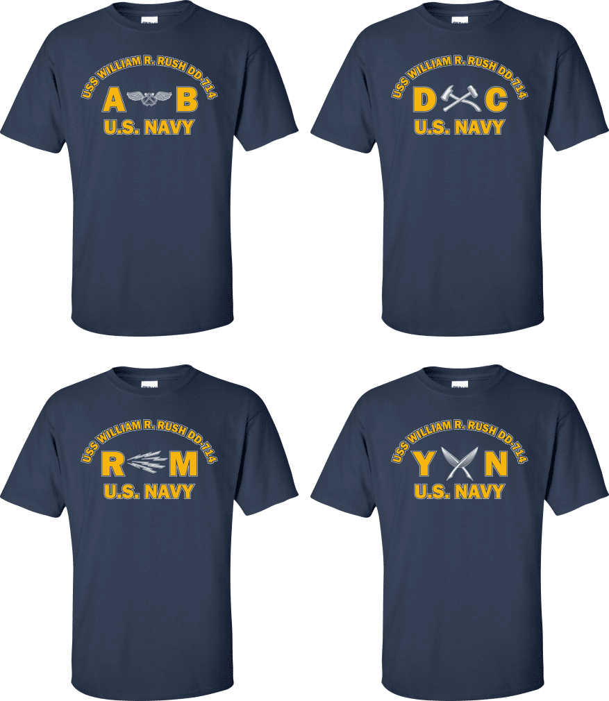 Due to disruptions in supply chains, this design will be embroidered on a Champion, Gildan, Jerzees or comparable brand.Proudly display your ship and rate with our top quality USS WILLIAM R. RUSH DD-714 Rates t-shirts, sweatshirts, and hoodies. These fine U.S. Navy apparel items will make you the envy of your veteran buddies, or will make a fine gift! Our USS WILLIAM R. RUSH DD-714 shirts are proudly printed in the USA!