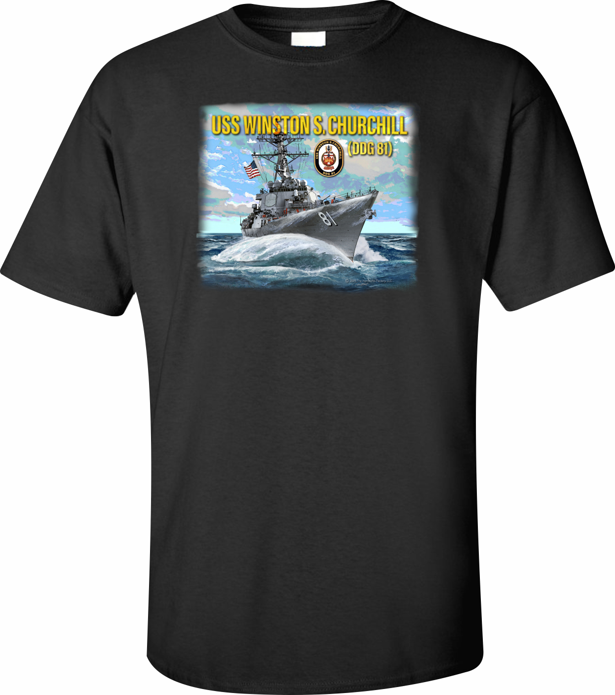 MilitaryBest is proud to offer this fine USS Winston S. Churchill DDG-81 Printed Art T-Shirt. This shirt features a full front print, with beautiful artwork designed by licensed Navy artist David Hart. This shirt is available in black and navy blue colors. Each T-shirt is proudly printed in the USA.Unless there is a defect in workmanship or material, these shirts are unreturnable.
