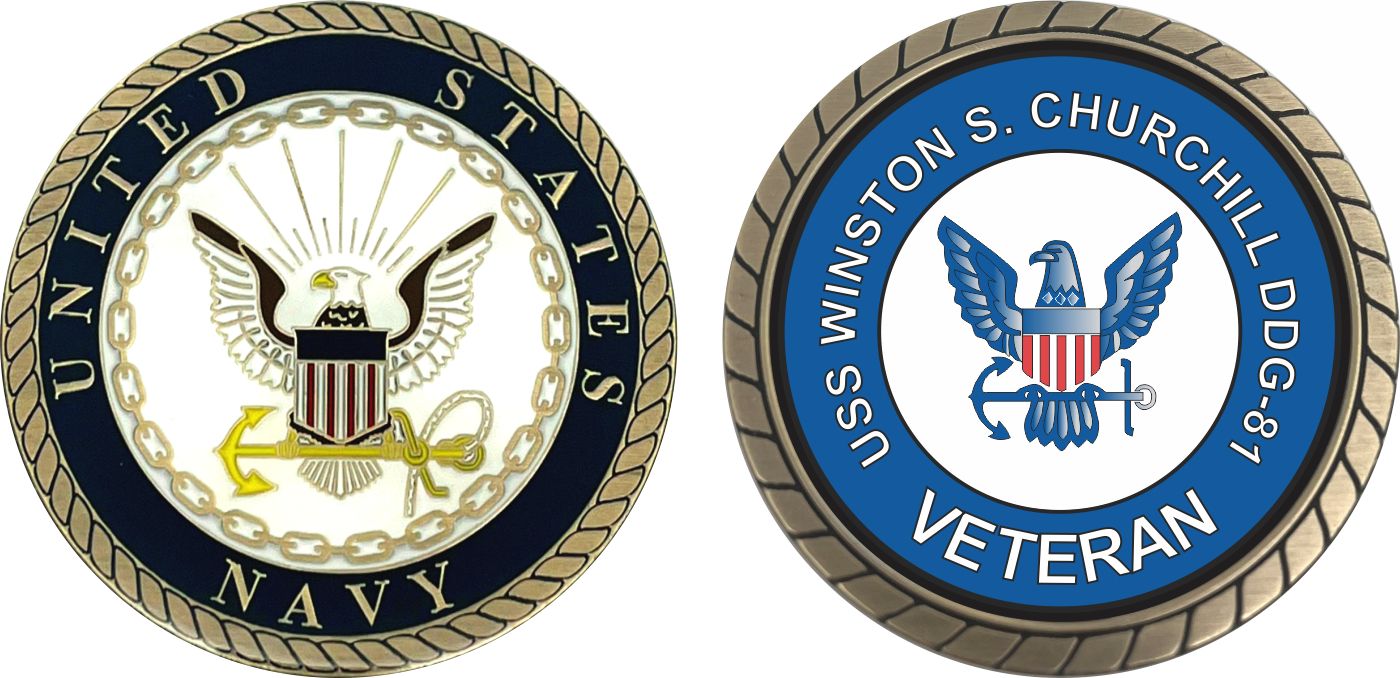 This 1 3/4 USS Winston S Churchill DDG-81 Veteran Challenge Coin is proudly offered by MilitaryBest. This Officially Licensed Navy coin has beautiful enamel finish on one side and an organized crisp clean USS Winston S Churchill DDG-81 Veteran design on the opposite side.