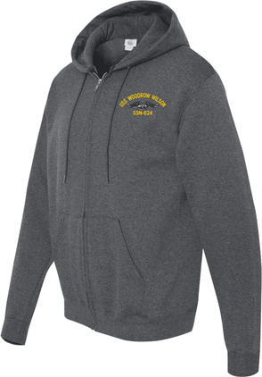 MilitaryBest has expanded its line of apparel with this custom embroidered USS Woodrow Wilson SSN-624 with Dolphins Embroidered Zippered Hoodie. Each Hoodie is direct embroidered onto a Champion brand 9.5 oz 50/50 Cotton Poly blend. This will make an excellent addition to your wardrobe, or a great gift. Your satisfaction is Guaranteed! These quality zippered hoodies are proudly embroidered at our facilities in Scottsboro, AL. Support the Army MWR program by purchasing only from Licensed Vendors.
