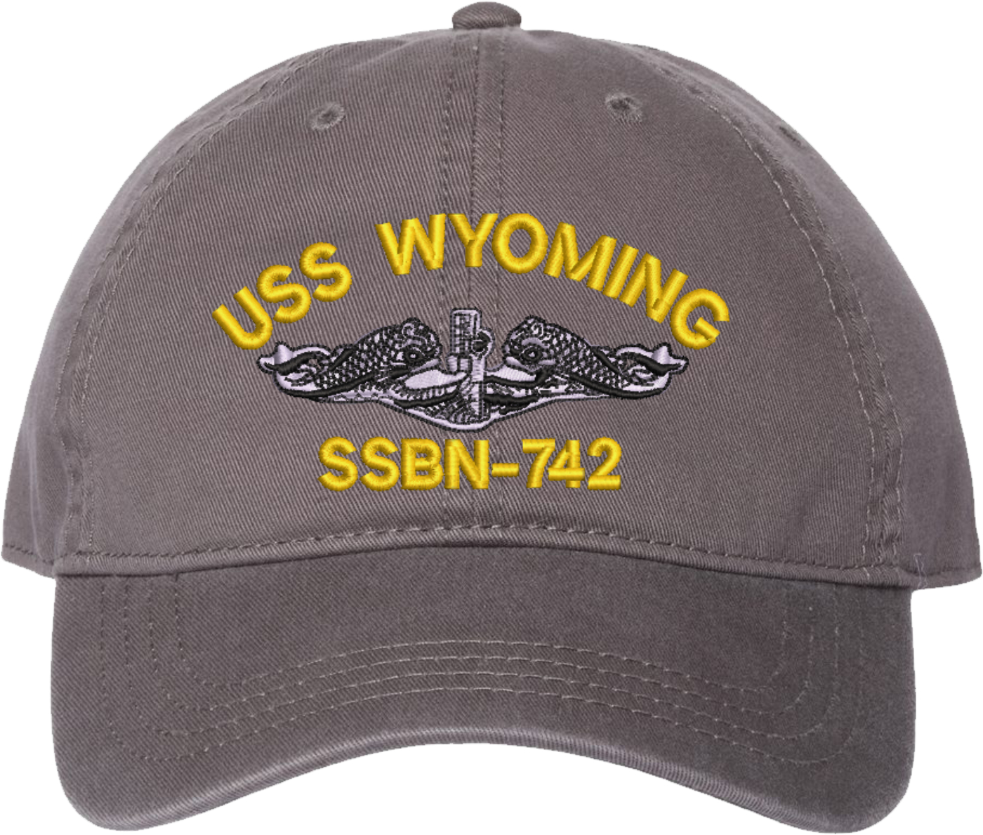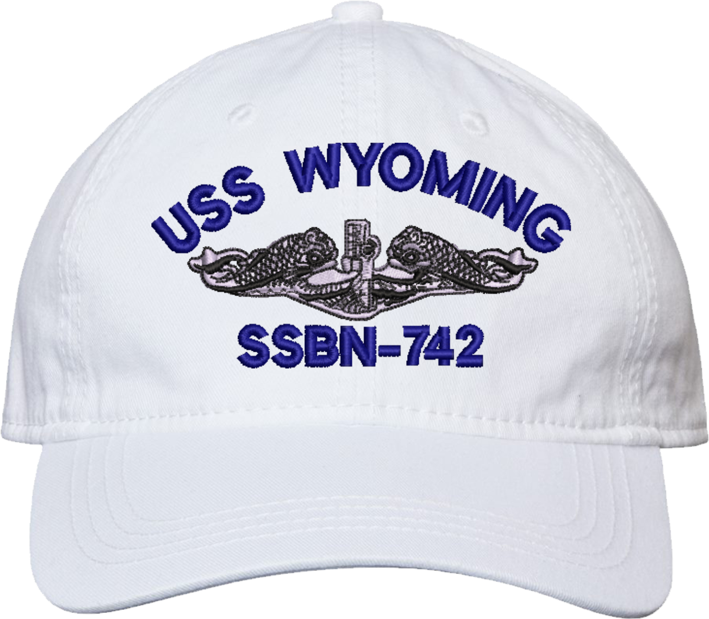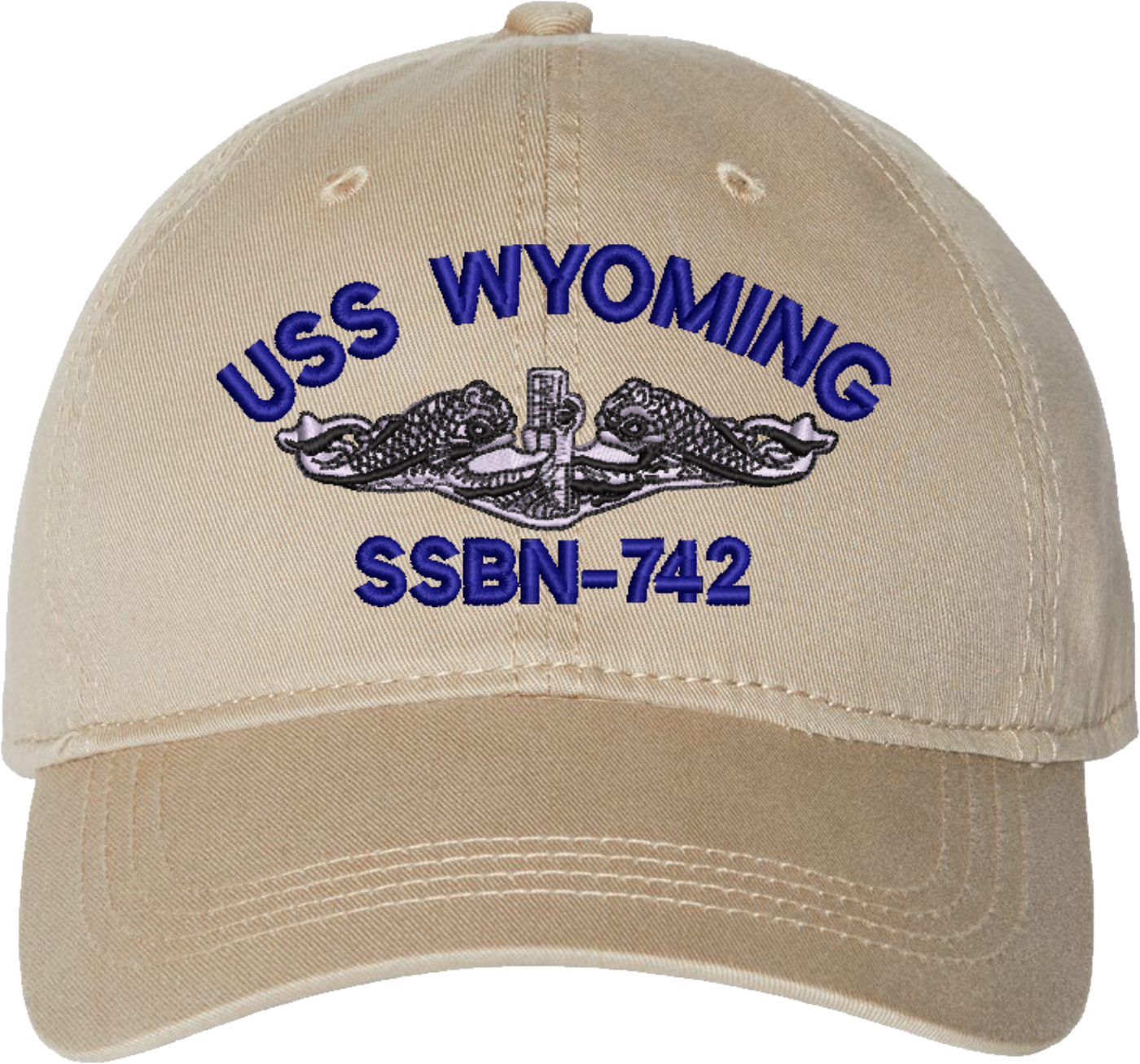 Show your Navy pride with this USS Wyoming SSBN-742 with Dolphins Unstructured Dad Cap from MilitaryBest. Crafted from 100% washed chino twill cotton, this six-panel, low-profile cap offers a relaxed and comfortable fit. Featuring high-quality embroidery done in our Scottsboro, Alabama facility, this cap is designed with a pre-curved visor and an adjustable tri-glide buckle closure for a perfect fit. Whether for everyday wear or as a meaningful gift, this cap is a great way to honor your own or a loved one's service.For caps ordered with custom embroidered personalized text please allow an additional 3 to 5 days production time. All custom back text will be embroidered in ALL CAPITAL LETTERS. Caps with back text or eggs are non-returnable unless there is a material defect in the cap.