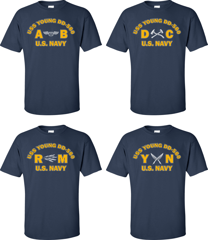 Due to disruptions in supply chains, this design will be embroidered on a Champion, Gildan, Jerzees or comparable brand.Proudly display your ship and rate with our top quality USS YOUNG DD-580 Rates t-shirts, sweatshirts, and hoodies. These fine U.S. Navy apparel items will make you the envy of your veteran buddies, or will make a fine gift! Our USS YOUNG DD-580 shirts are proudly printed in the USA!