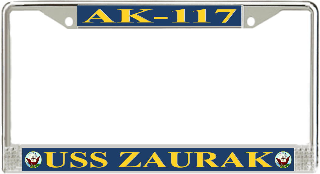 USS Zaurak AK-117 License Plate FrameThis USS Zaurak AK-117 License Plate Frame is proudly made in the USA at our facilities in Scottsboro, Alabama. Each of our MilitaryBest U.S. Navy Frames feature top and bottom Poly Coated Aluminum strips that are printed using sublimation which gives these quality automobile military frames a beautiful high gloss finish.