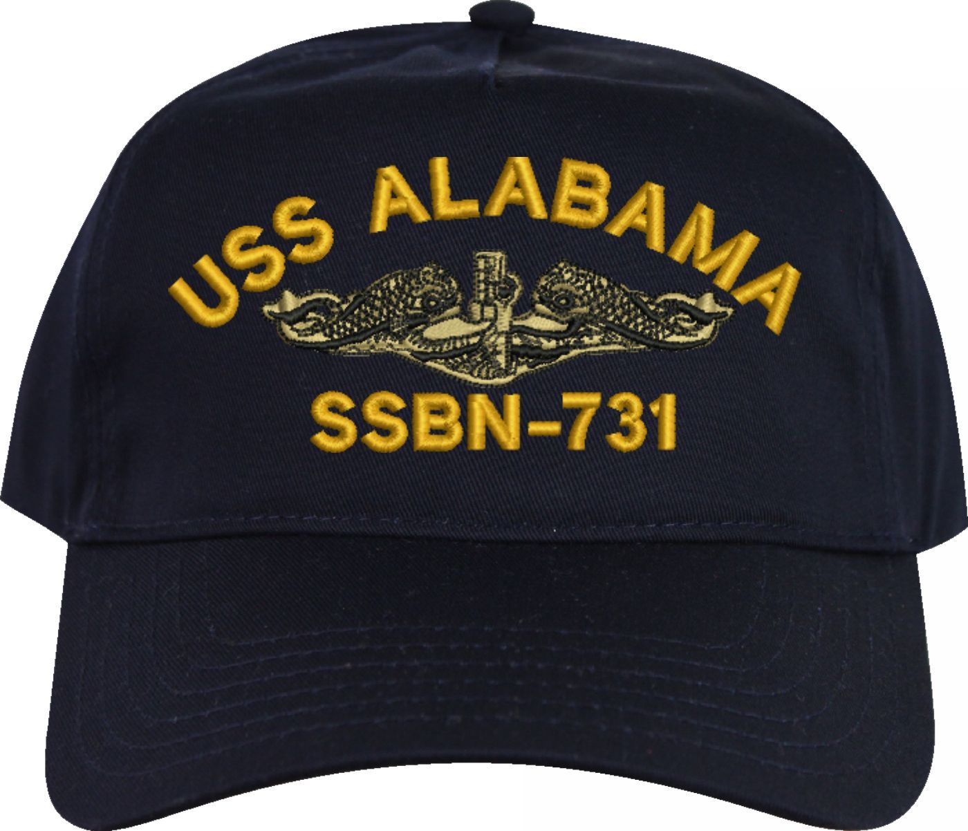 MilitaryBest is proud to offer this USS Alabama SSBN-731 with Gold Dolphins Embroidered Cap. The design of this Cap is crisp, clean, and sure to be loved by people of all ages! This Cap is crafted by our skilled embroidery technicians at our facilities in Scottsboro, AL. As with all MilitaryBest items, your satisfaction is guaranteed!