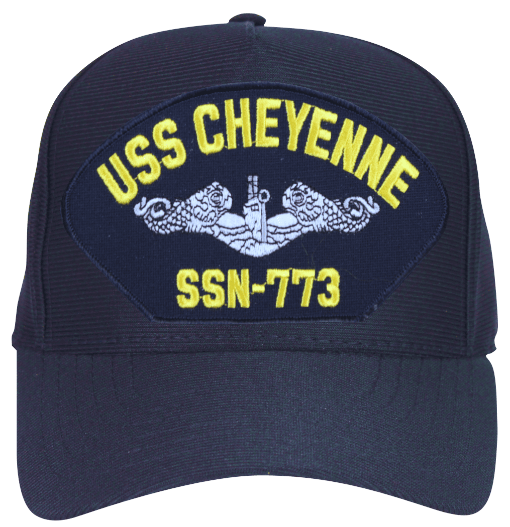 This USS Cheyenne SSN-773 ( Silver Dolphins ) Submarine Enlisted Cap is an emblematic, poly, dark under the visor cap. Each has an adjustable strap, and is available as a 5 panel high profile or 6 panel low profile cap. All MilitaryBest caps are fully guaranteed. Some people call them Military Covers or Military Hats. This Military Cap is proudly Made in The U.S.A.For caps ordered with custom embroidered personalized text please allow an additional 3 to 5 days production time. All custom back text will be embroidered in ALL CAPITAL LETTERS. Caps with back text or eggs are non-returnable unless there is a material defect in the cap. If a style is not selected the cap will be made using a high profile style cap as pictured.