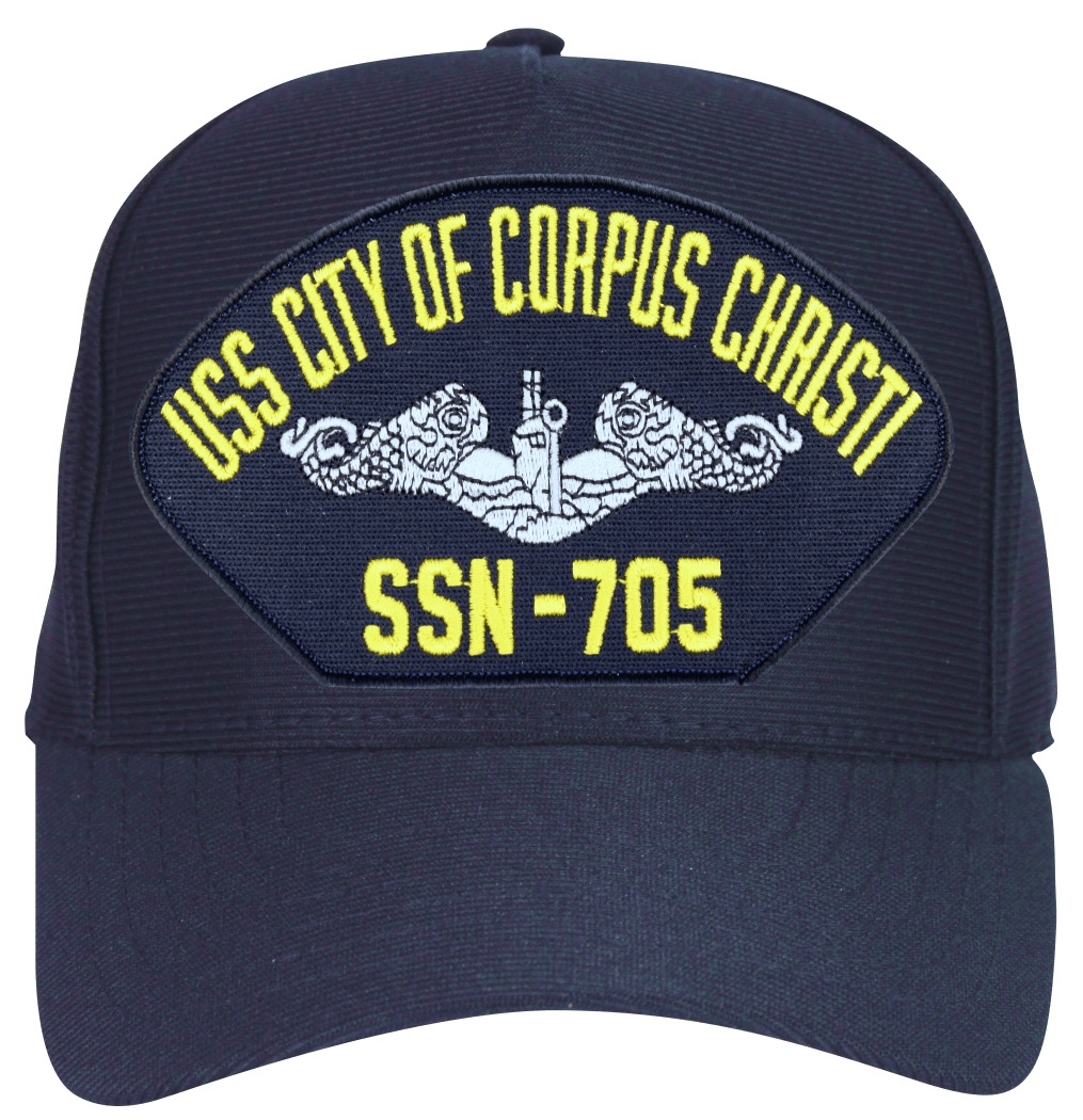 This USS City of Corpus Christi SSN-705 ( Silver Dolphins ) Submarine Enlisted Cap is an emblematic, poly, dark under the visor cap. Each has an adjustable strap, and is available as a 5 panel high profile or 6 panel low profile cap. All MilitaryBest caps are fully guaranteed. Some people call them Military Covers or Military Hats. This Military Cap is proudly Made in The U.S.A.For caps ordered with custom embroidered personalized text please allow an additional 3 to 5 days production time. All custom back text will be embroidered in ALL CAPITAL LETTERS. Caps with back text or eggs are non-returnable unless there is a material defect in the cap. If a style is not selected the cap will be made using a high profile style cap as pictured.