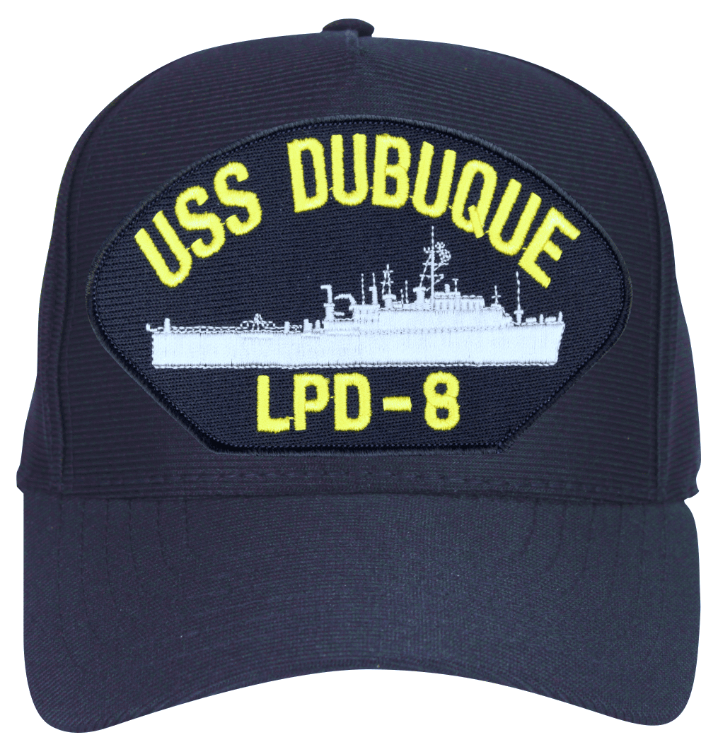 This USS Dubuque LPD-8 Ships Ball Cap is an emblematic, poly, dark under the visor cap. Each has an adjustable strap, and is available as a 5 panel high profile or 6 panel low profile cap. All MilitaryBest caps are fully guaranteed. Some people call them Military Covers or Military Hats. This Military Cap is proudly Made in The U.S.A.For caps ordered with custom embroidered personalized text please allow an additional 3 to 5 days production time. All custom back text will be embroidered in ALL CAPITAL LETTERS. Caps with back text or eggs are non-returnable unless there is a material defect in the cap. If a style is not selected the cap will be made using a high profile style cap as pictured.