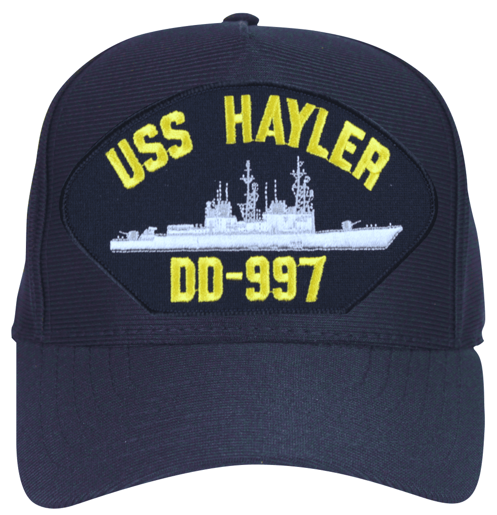 This USS Hayler DD-997 Ship Cap is an emblematic, poly, dark under the visor cap. Each has an adjustable strap, and is available as a 5 panel high profile or 6 panel low profile cap. All MilitaryBest caps are fully guaranteed. Some people call them Military Covers or Military Hats. This Military Cap is proudly Made in The U.S.A.For caps ordered with custom embroidered personalized text please allow an additional 3 to 5 days production time. All custom back text will be embroidered in ALL CAPITAL LETTERS. Caps with back text or eggs are non-returnable unless there is a material defect in the cap. If a style is not selected the cap will be made using a high profile style cap as pictured.