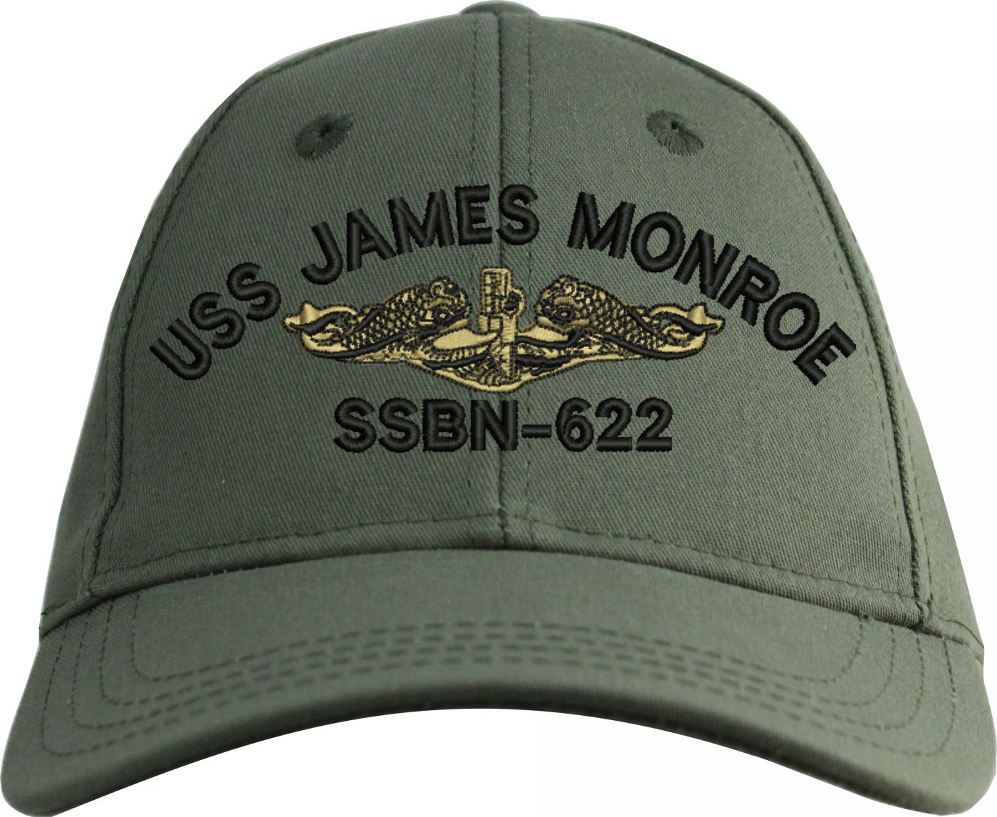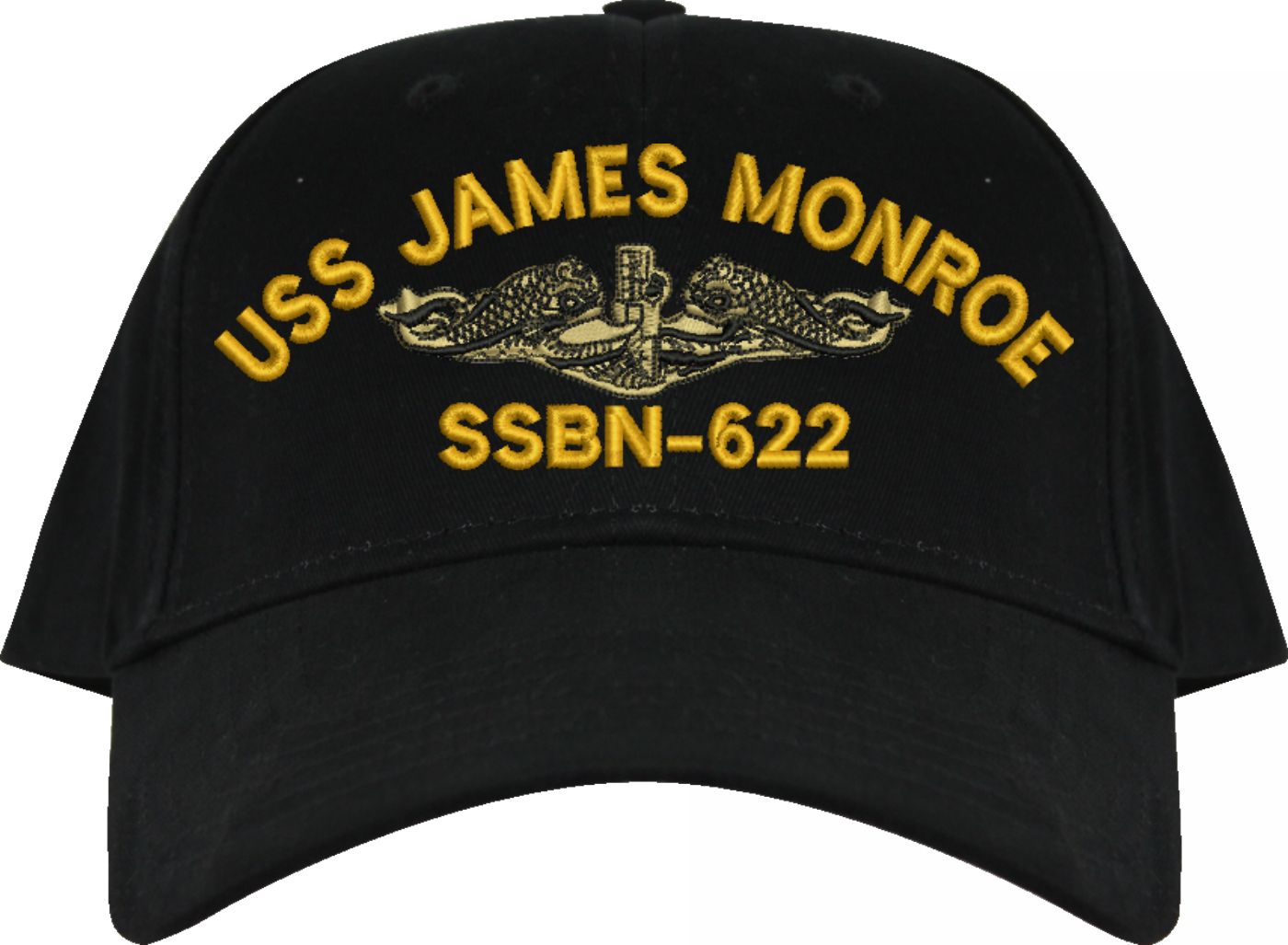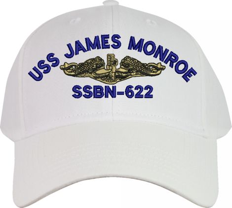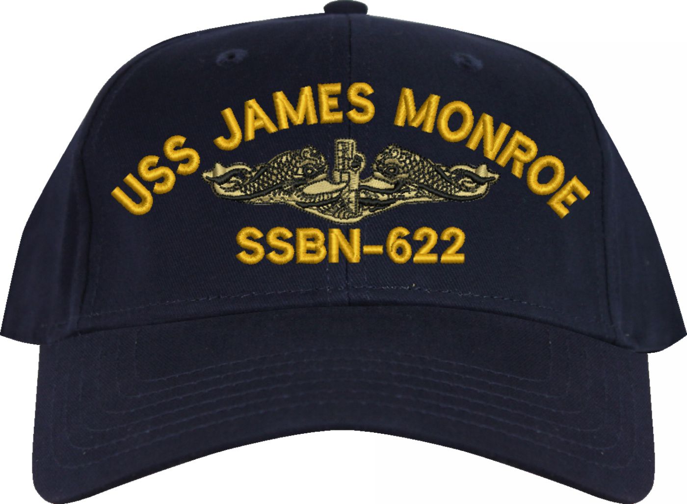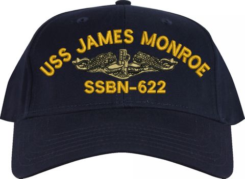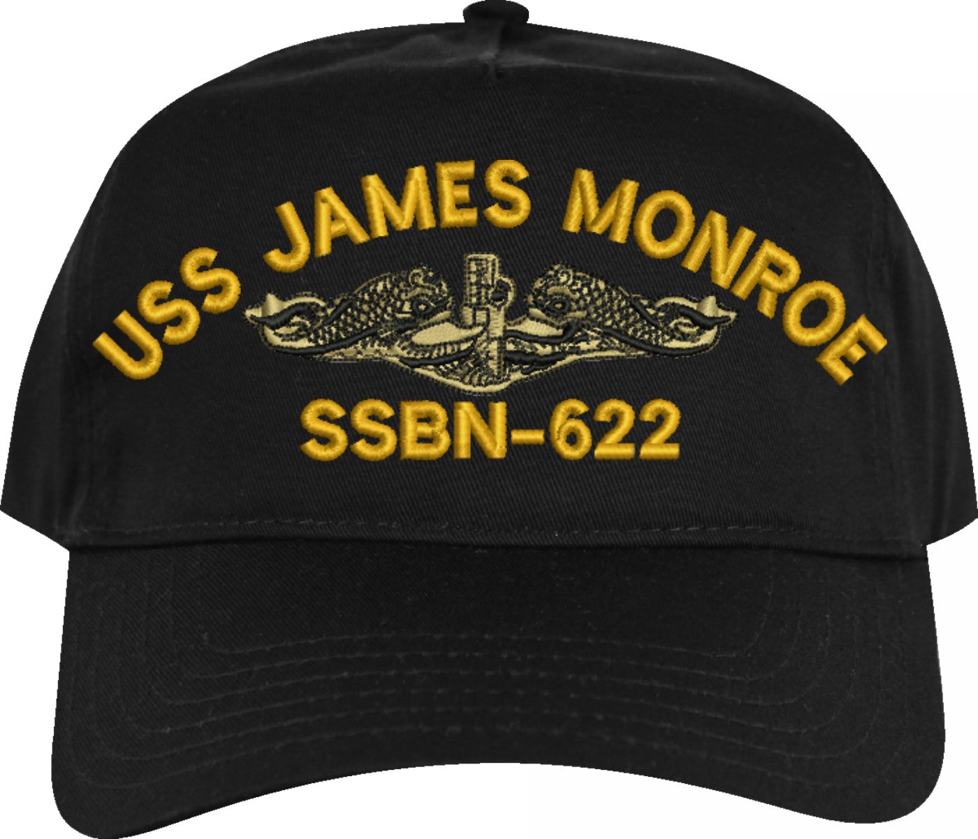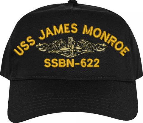 MilitaryBest is proud to offer this USS James Monroe SSBN-622 with Gold Dolphins Embroidered Cap. The design of this Cap is crisp, clean, and sure to be loved by people of all ages! This Cap is crafted by our skilled embroidery technicians at our facilities in Scottsboro, AL. As with all MilitaryBest items, your satisfaction is guaranteed!