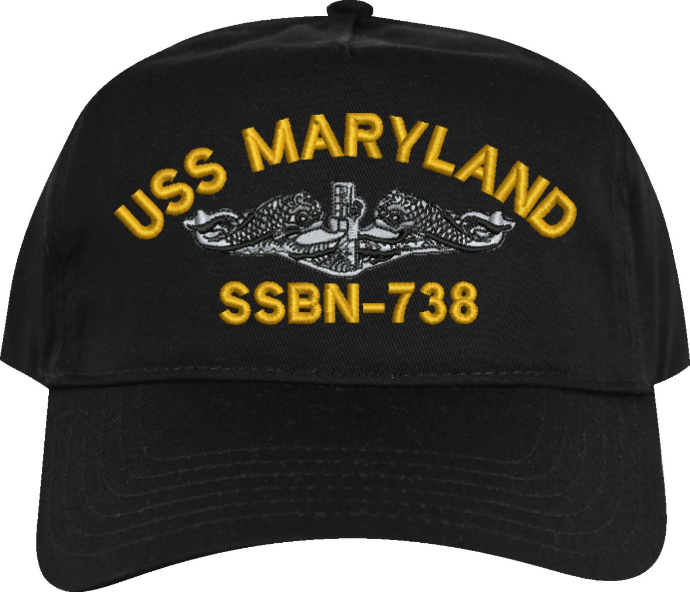 MilitaryBest is proud to offer this USS Maryland SSBN-738 w/Dolphins Embroidered Cap. The design of this Cap is crisp, clean, and sure to be loved by people of all ages! This Cap is crafted by our skilled embroidery technicians at our facilities in Scottsboro, AL. As with all MilitaryBest items, your satisfaction is guaranteed!