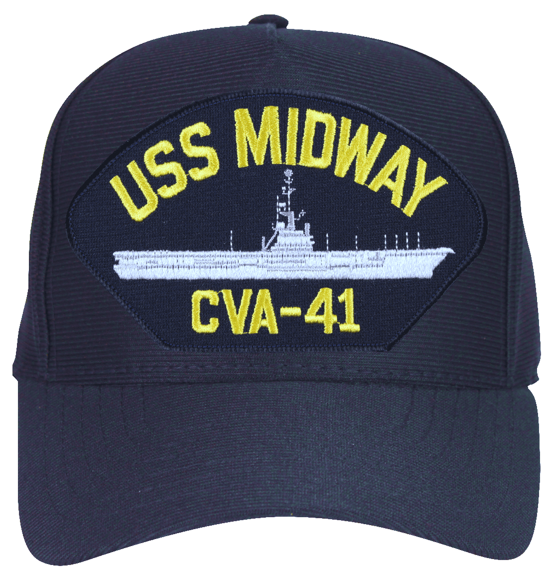 This USS Midway CVA-41 Ships Ball Cap is an emblematic, poly, dark under the visor cap. Each has an adjustable strap, and is available as a 5 panel high profile or 6 panel low profile cap. All MilitaryBest caps are fully guaranteed. Some people call them Military Covers or Military Hats. This Military Cap is proudly Made in The U.S.A.For caps ordered with custom embroidered personalized text please allow an additional 3 to 5 days production time. All custom back text will be embroidered in ALL CAPITAL LETTERS. Caps with back text or eggs are non-returnable unless there is a material defect in the cap. If a style is not selected the cap will be made using a high profile style cap as pictured.