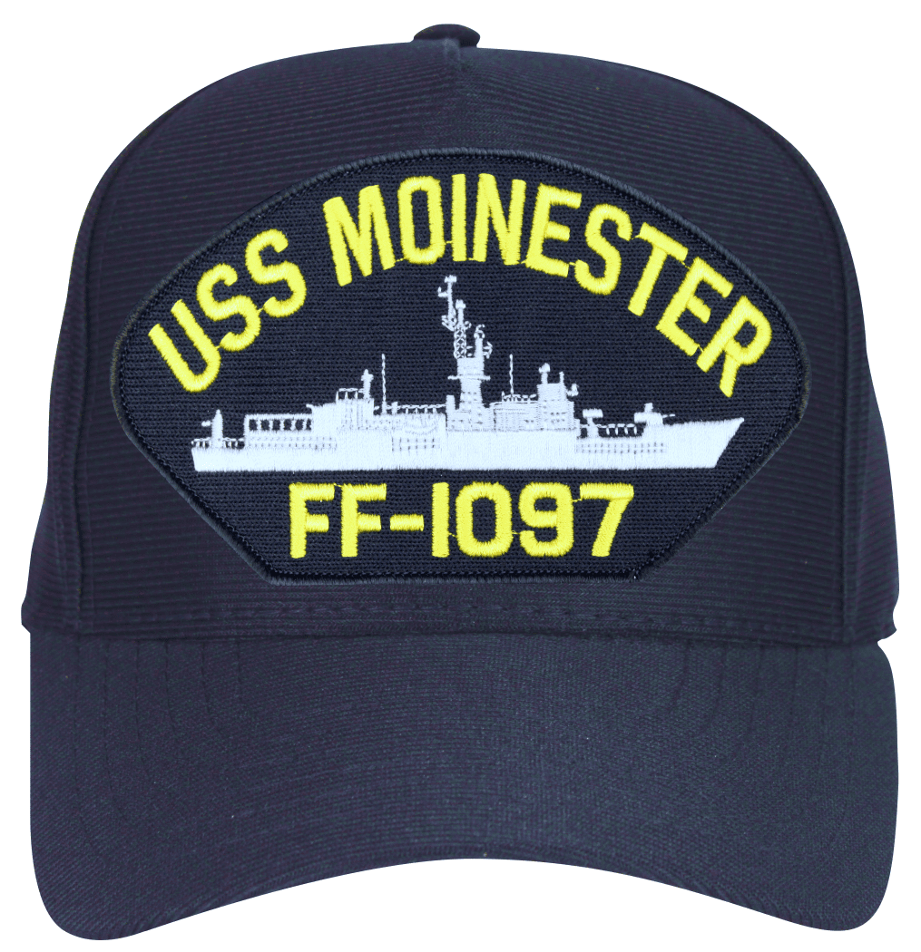 This USS Moinester FF-1097 Ship Cap is an emblematic, poly, dark under the visor cap. Each has an adjustable strap, and is available as a 5 panel high profile or 6 panel low profile cap. All MilitaryBest caps are fully guaranteed. Some people call them Military Covers or Military Hats. This Military Cap is proudly Made in The U.S.A.For caps ordered with custom embroidered personalized text please allow an additional 3 to 5 days production time. All custom back text will be embroidered in ALL CAPITAL LETTERS. Caps with back text or eggs are non-returnable unless there is a material defect in the cap. If a style is not selected the cap will be made using a high profile style cap as pictured.