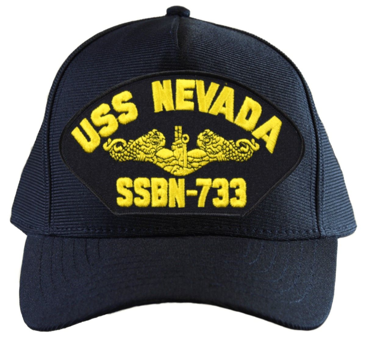 This USS Nevada SSBN-733 ( Gold Dolphins ) Submarine Officer Cap is an emblematic, poly, dark under the visor cap. Each has an adjustable strap, and is available as a 5 panel high profile or 6 panel low profile cap. All MilitaryBest caps are fully guaranteed. Some people call them Military Covers or Military Hats. This Military Cap is proudly Made in The U.S.A.For caps ordered with custom embroidered personalized text please allow an additional 3 to 5 days production time. All custom back text will be embroidered in ALL CAPITAL LETTERS. Caps with back text or eggs are non-returnable unless there is a material defect in the cap. If a style is not selected the cap will be made using a high profile style cap as pictured.