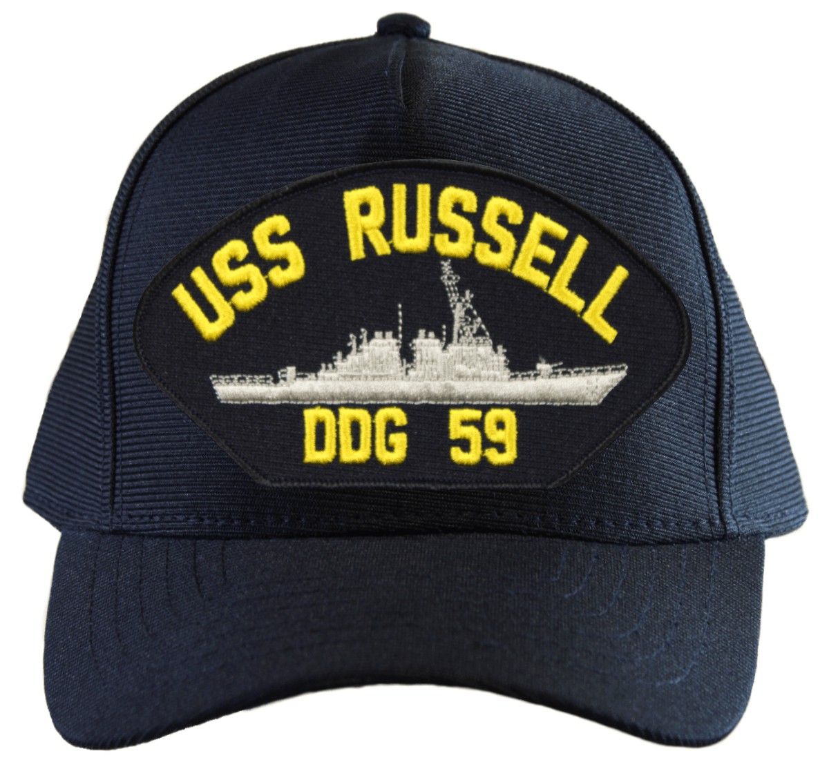 This USS Russell DDG 59 Ship Cap is an emblematic, poly, dark under the visor cap. Each has an adjustable strap, and is available as a 5 panel high profile or 6 panel low profile cap. All MilitaryBest caps are fully guaranteed. Some people call them Military Covers or Military Hats. This Military Cap is proudly Made in The U.S.A.For caps ordered with custom embroidered personalized text please allow an additional 3 to 5 days production time. All custom back text will be embroidered in ALL CAPITAL LETTERS. Caps with back text or eggs are non-returnable unless there is a material defect in the cap. If a style is not selected the cap will be made using a high profile style cap as pictured.