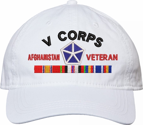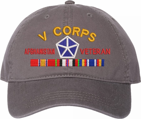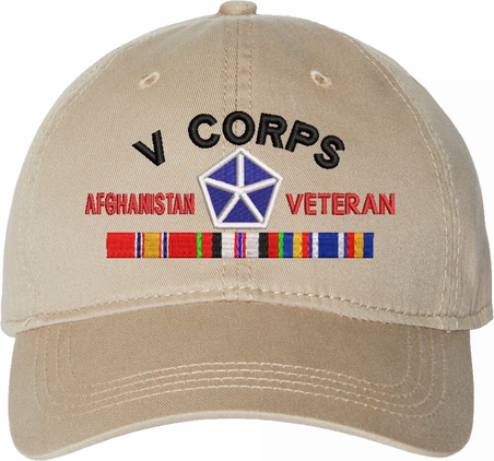 Show your Army pride with this V Corps Afghanistan Veteran with Ribbons Unstructured Dad Cap from MilitaryBest. Crafted from 100% washed chino twill cotton, this six-panel, low-profile cap offers a relaxed and comfortable fit. Featuring high-quality embroidery done in our Scottsboro, Alabama facility, this cap is designed with a pre-curved visor and an adjustable tri-glide buckle closure for a perfect fit. Whether for everyday wear or as a meaningful gift, this cap is a great way to honor your own or a loved one's service.For caps ordered with custom embroidered personalized text please allow an additional 3 to 5 days production time. All custom back text will be embroidered in ALL CAPITAL LETTERS. Caps with back text or eggs are non-returnable unless there is a material defect in the cap.