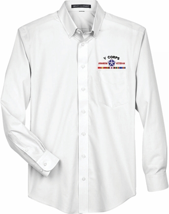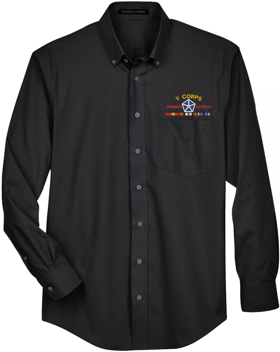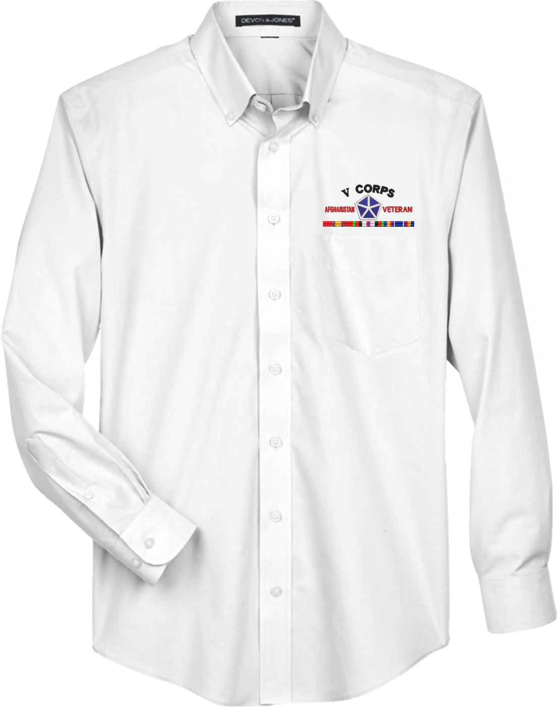 MilitaryBest has expanded its line of apparel with this V Corps Afghanistan Veteran with Ribbons Embroidered Dress Shirt. This long sleeve button down dress shirt is made using a stain-release, wrinkle-free, 55% cotton/45% polyester material. The pocket over the left chest measures 4 3/4" across. Featuring a V Corps Afghanistan Veteran with Ribbons design above the pocket, this shirt is embroidered to order at our facilities in Scottsboro, AL..- 55% cotton/45% polyester