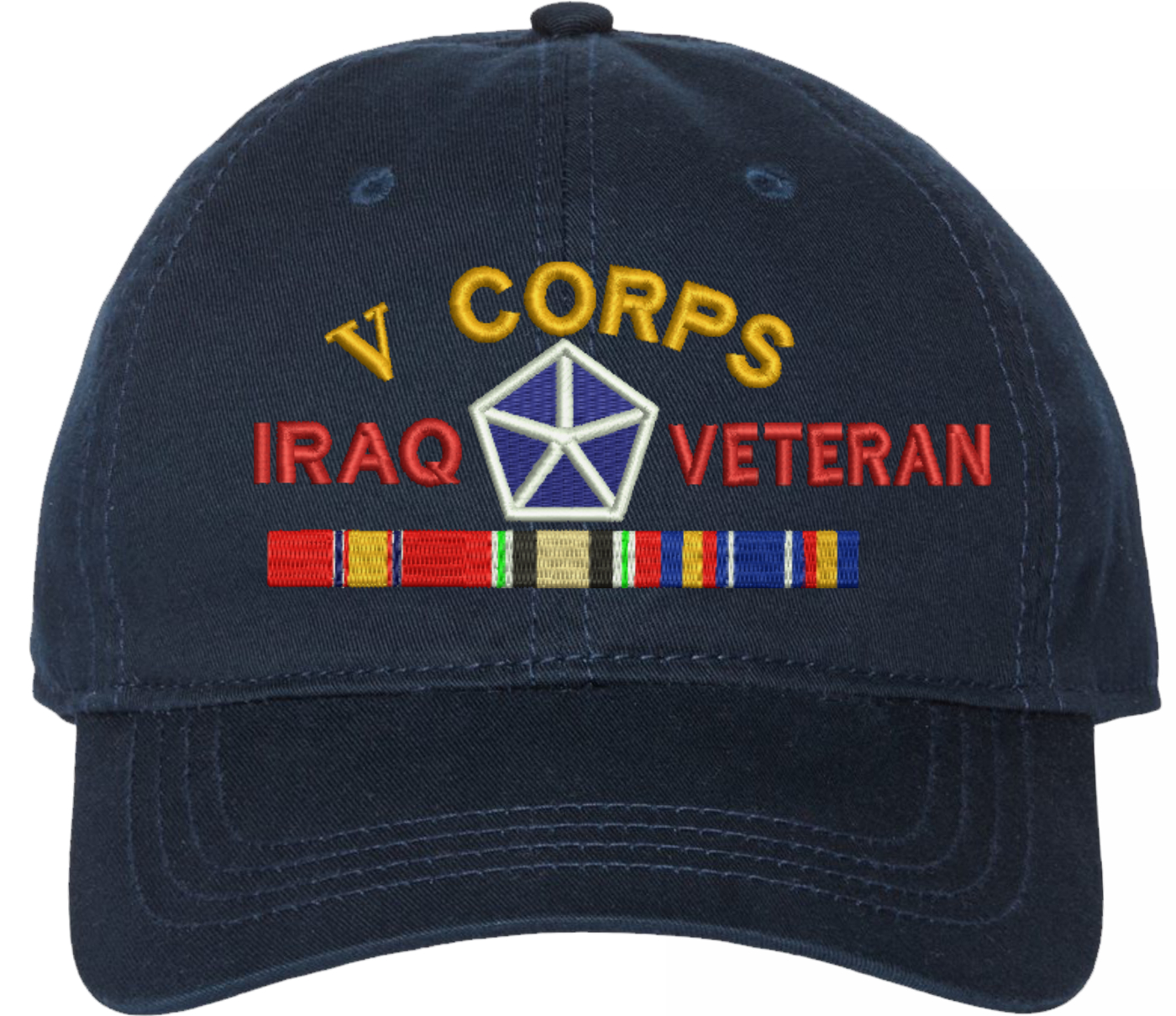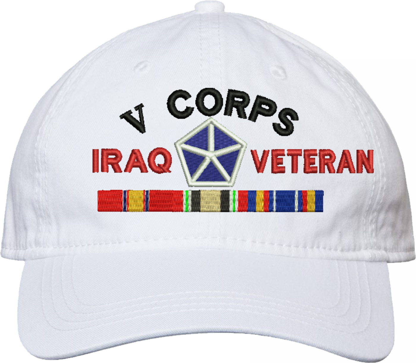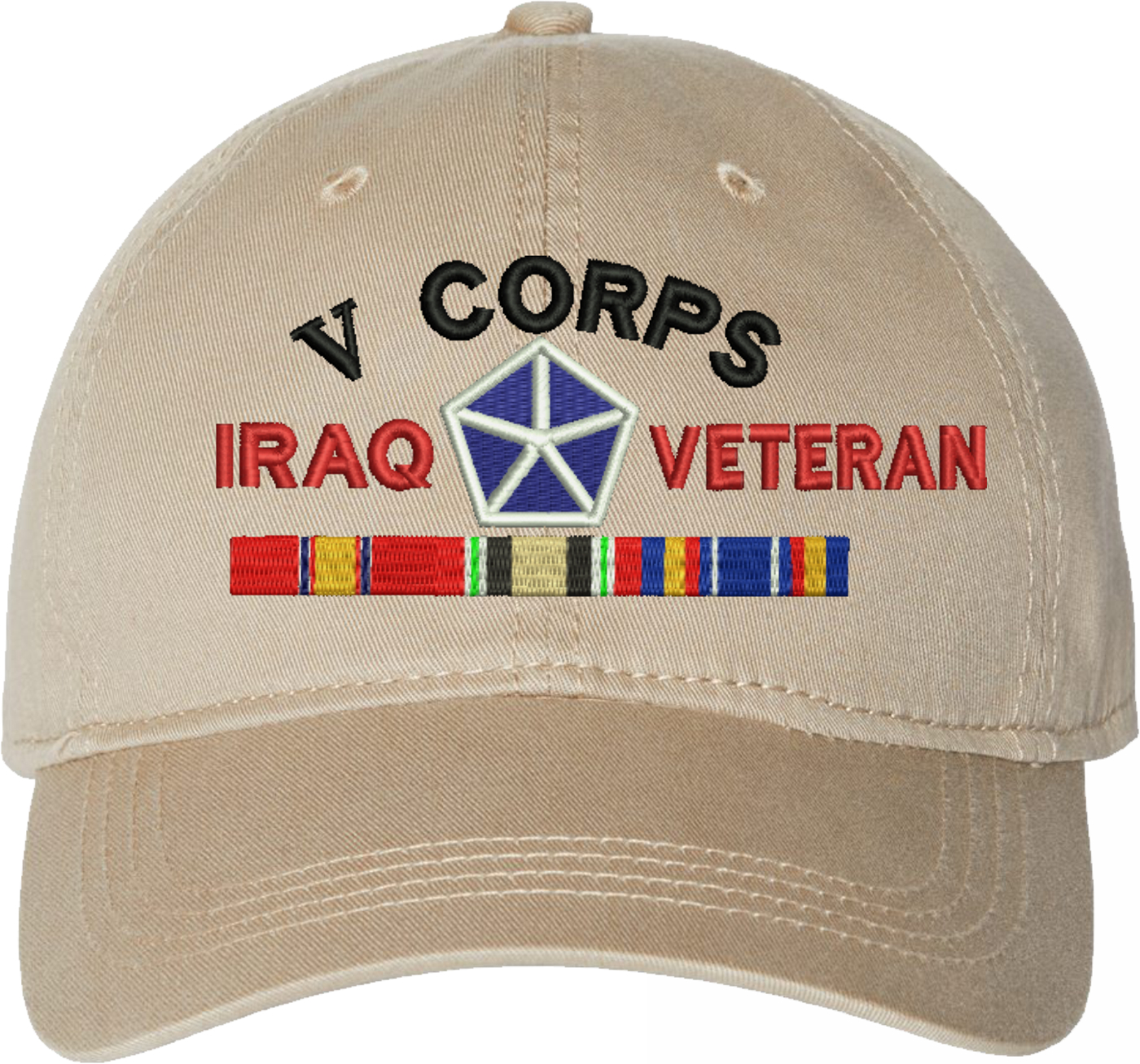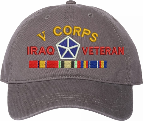 Show your Army pride with this V Corps Iraq Veteran with Ribbons Unstructured Dad Cap from MilitaryBest. Crafted from 100% washed chino twill cotton, this six-panel, low-profile cap offers a relaxed and comfortable fit. Featuring high-quality embroidery done in our Scottsboro, Alabama facility, this cap is designed with a pre-curved visor and an adjustable tri-glide buckle closure for a perfect fit. Whether for everyday wear or as a meaningful gift, this cap is a great way to honor your own or a loved one's service.For caps ordered with custom embroidered personalized text please allow an additional 3 to 5 days production time. All custom back text will be embroidered in ALL CAPITAL LETTERS. Caps with back text or eggs are non-returnable unless there is a material defect in the cap.