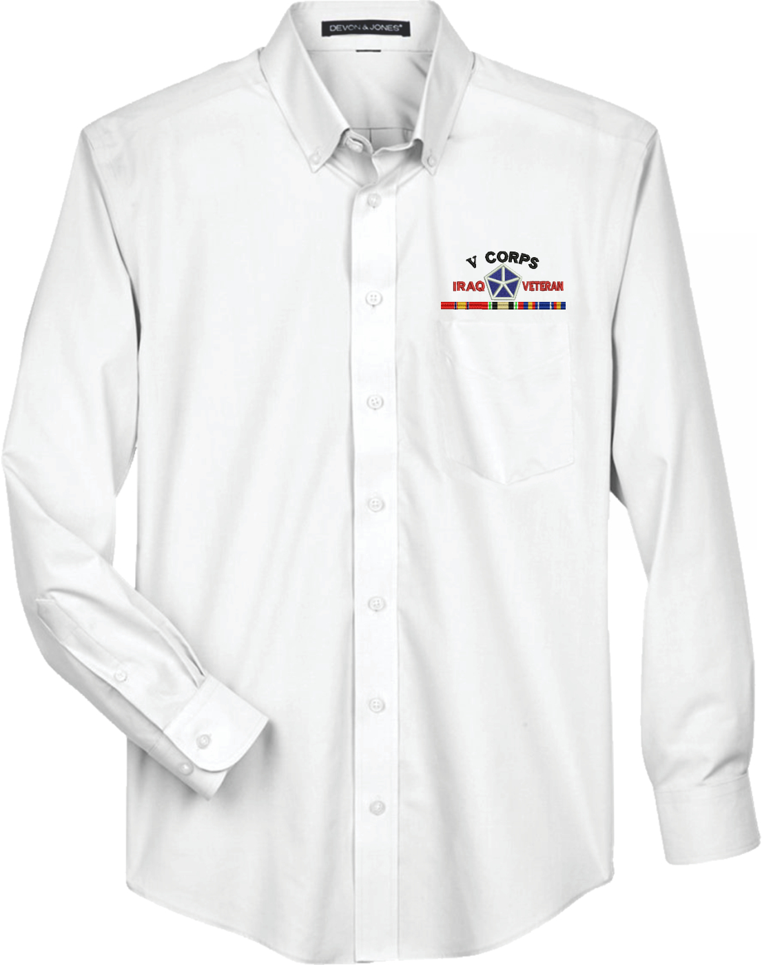 MilitaryBest has expanded its line of apparel with this V Corps Iraq Veteran with Ribbons Embroidered Dress Shirt. This long sleeve button down dress shirt is made using a stain-release, wrinkle-free, 55% cotton/45% polyester material. The pocket over the left chest measures 4 3/4" across. Featuring a V Corps Iraq Veteran with Ribbons design above the pocket, this shirt is embroidered to order at our facilities in Scottsboro, AL..- 55% cotton/45% polyester