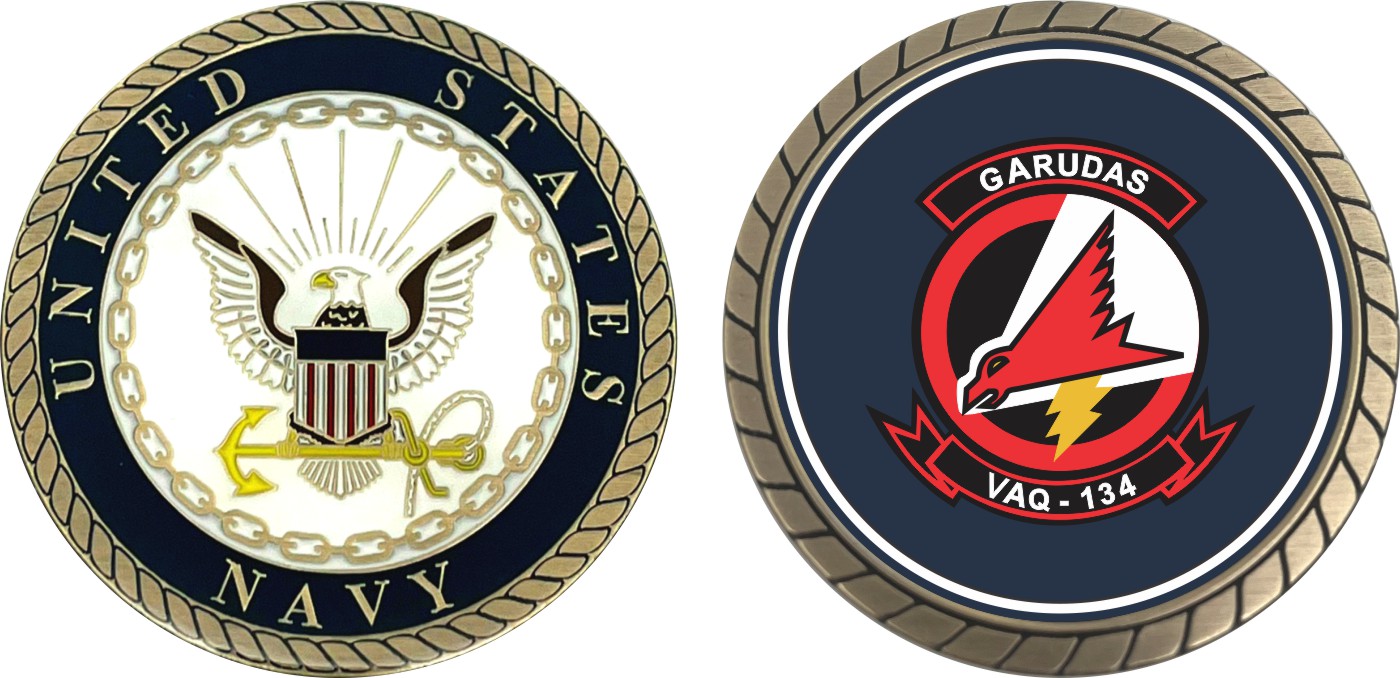 This 1 3/4” VAQ -134 "Garudas" Challenge Coin is proudly offered by Militarybest. This Officially Licensed Navy coin has beautiful enamel finish on one side and an organized crisp clean design on the opposite side.