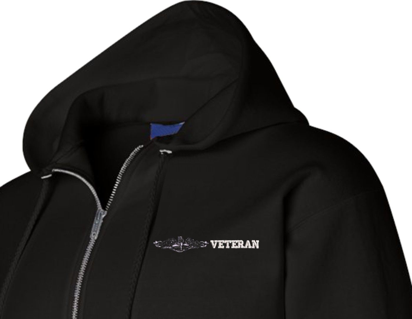 MilitaryBest is proud to offer this quality U.S. Navy Enlisted Silver Dolphins Veteran Zippered Hoodie. Each U.S. Navy Zippered Hoodie is direct embroidered onto either a Champion or Gildan brand Zippered Hoodie using a 9.5 oz 50/50 Cotton Poly blend material. These Military Zippered Hoodies are proudly embroidered at our facilities in Scottsboro, AL.