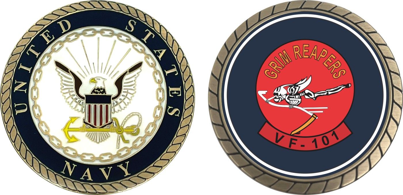 This 1 3/4” VF-101 'Grim Reapers' Patch Challenge Coin is proudly offered by Militarybest. This Officially Licensed Navy coin has beautiful enamel finish on one side and an organized crisp clean design on the opposite side.