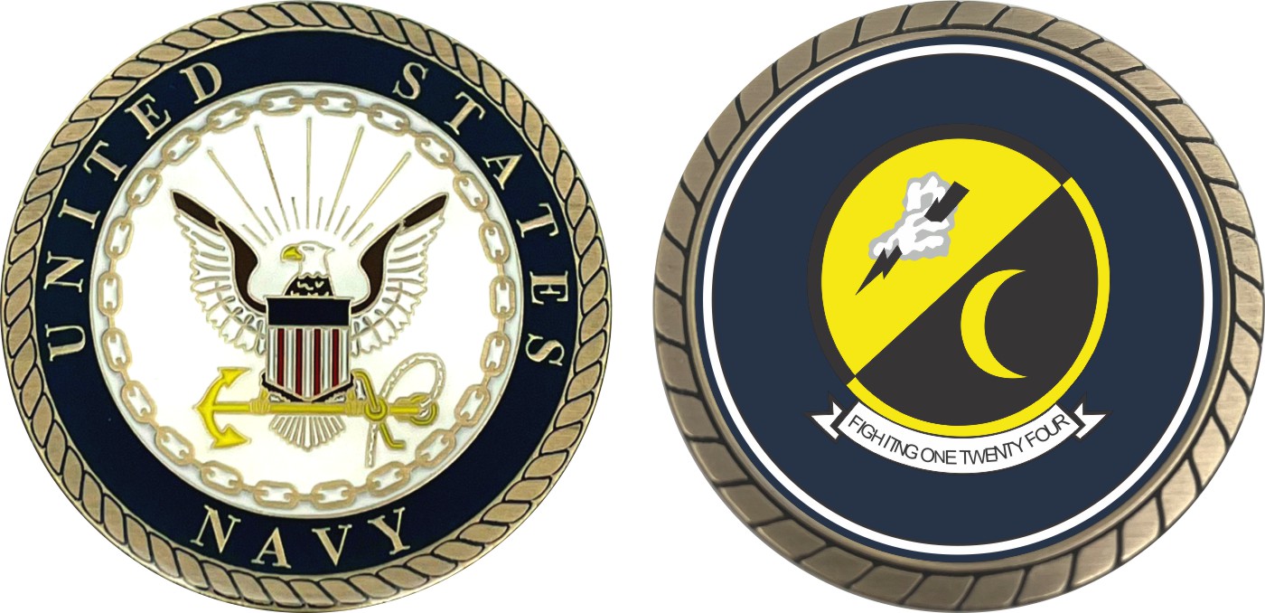 This 1 3/4” VF-124 Fighting One Twenty Four Patch Challenge Coin is proudly offered by Militarybest. This Officially Licensed Navy coin has beautiful enamel finish on one side and an organized crisp clean design on the opposite side.