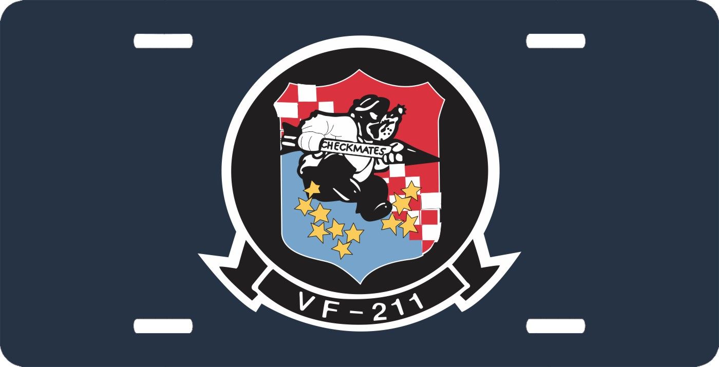 This VF-211 'Fighting Checkmates' Patch License Plate is made from heavy gauge aluminum and has a baked enamel finish to last for many years of use. Each plate measures 5 15/16" x 11 15/16". This license plate would make a wonderful addition to your collection or a great gift.