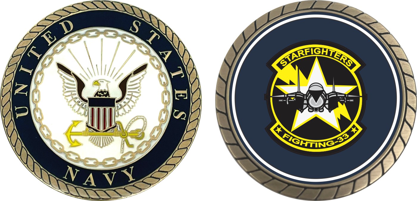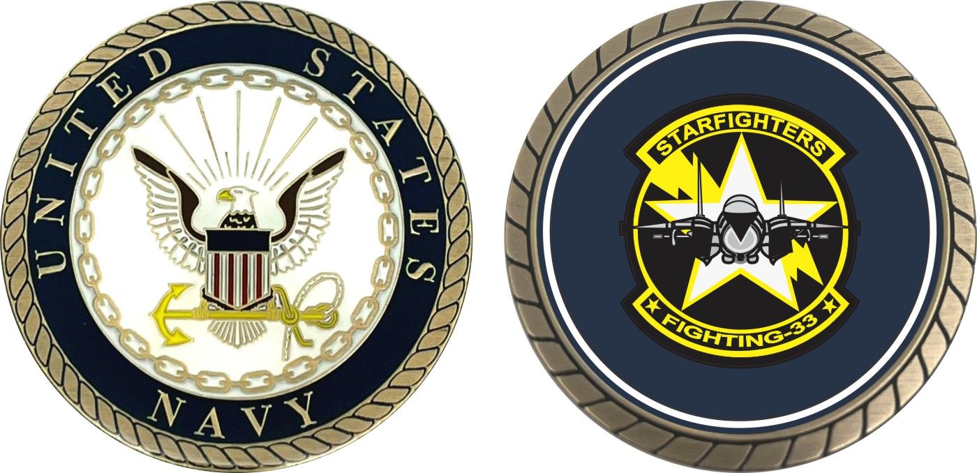 This 1 3/4” VF-33 'Star Fighters' Patch Challenge Coin is proudly offered by Militarybest. This Officially Licensed Navy coin has beautiful enamel finish on one side and an organized crisp clean design on the opposite side.