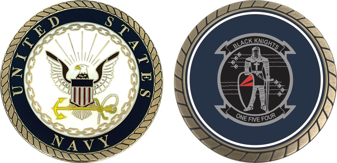 This 1 3/4” VF154 'Black Knights' Patch Challenge Coin is proudly offered by Militarybest. This Officially Licensed Navy coin has beautiful enamel finish on one side and an organized crisp clean design on the opposite side.
