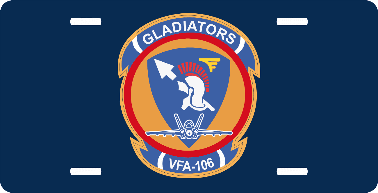 This VFA-106 Gladiators License Plate is made from heavy gauge aluminum and has a baked enamel finish to last for many years of use. Each plate measures 5 15/16" x 11 15/16". This license plate would make a wonderful addition to your collection or a great gift.