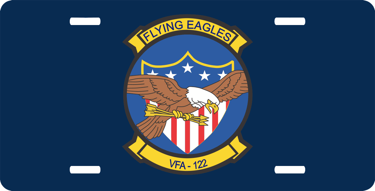 This VFA-122 Flying Eagles License Plate is made from heavy gauge aluminum and has a baked enamel finish to last for many years of use. Each plate measures 5 15/16" x 11 15/16". This license plate would make a wonderful addition to your collection or a great gift.