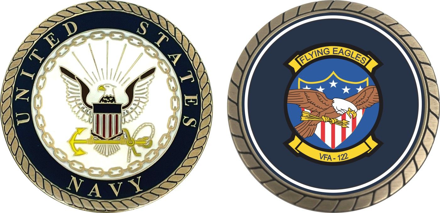 This 1 3/4” VFA-122 'Flying Eagles' Patch Challenge Coin is proudly offered by Militarybest. This Officially Licensed Navy coin has beautiful enamel finish on one side and an organized crisp clean design on the opposite side.