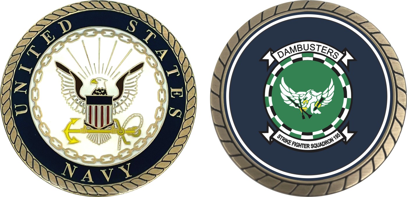 This 1 3/4” VFA-195 'Dambusters' Patch Challenge Coin is proudly offered by Militarybest. This Officially Licensed Navy coin has beautiful enamel finish on one side and an organized crisp clean design on the opposite side.