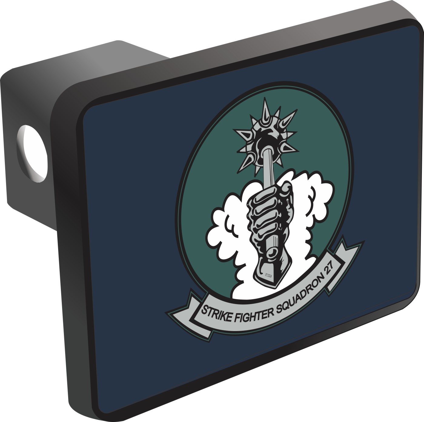 This VFA-27 'Royal Maces' Patch Hitch Cover is proudly Made in the USA. Each Hitch Cover's face plate measures 4.7" x 3.4" and is applied on a black heavy duty injection molded plastic 2" hitch cover; link pin not included. The face plate of the hitch cover is sublimation printed to provide a beautiful glossy finish sure to catch the eye. This hitch cover would make a wonderful addition to your truck or other vehicle.A percentage of the sale of each MilitaryBest item is forwarded to the licensing departments of each respective branch of service in support of the MWR (Morale, Welfare, & Recreation) program. These payments are made by either ALL4U LLC or the wholesaler from where the item originated. Our team thanks you for your service and your support of these programs.