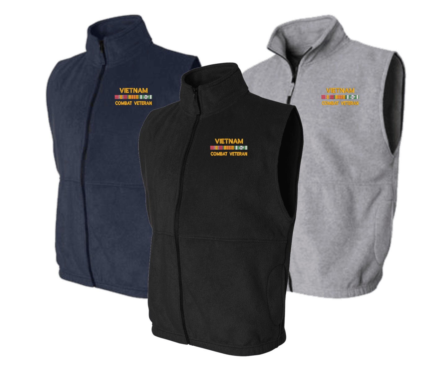 Due to supply chain disruptions, some colors and sizes may not be available in the same Brand, in these cases a brand of comparable quality will be used. Feel free to call in advance of your order, with questions you may have.MilitaryBest is expanding it's line of Men's apparel with this quality Vietnam Combat Veteran Full-Zip Fleece Vest. This Full-Zip Fleece Vests feature a convertible collar with dyed-to-match zipper pull, oversized nylon reinforced slash pockets, and an elastic hem. They are made out of 100% anti-pill polyester. This vest will make an excellent addition to your wardrobe, or a quality gift. Your satisfaction is guaranteed! All embroidery is done at our facilities in Scottsboro, AL.
