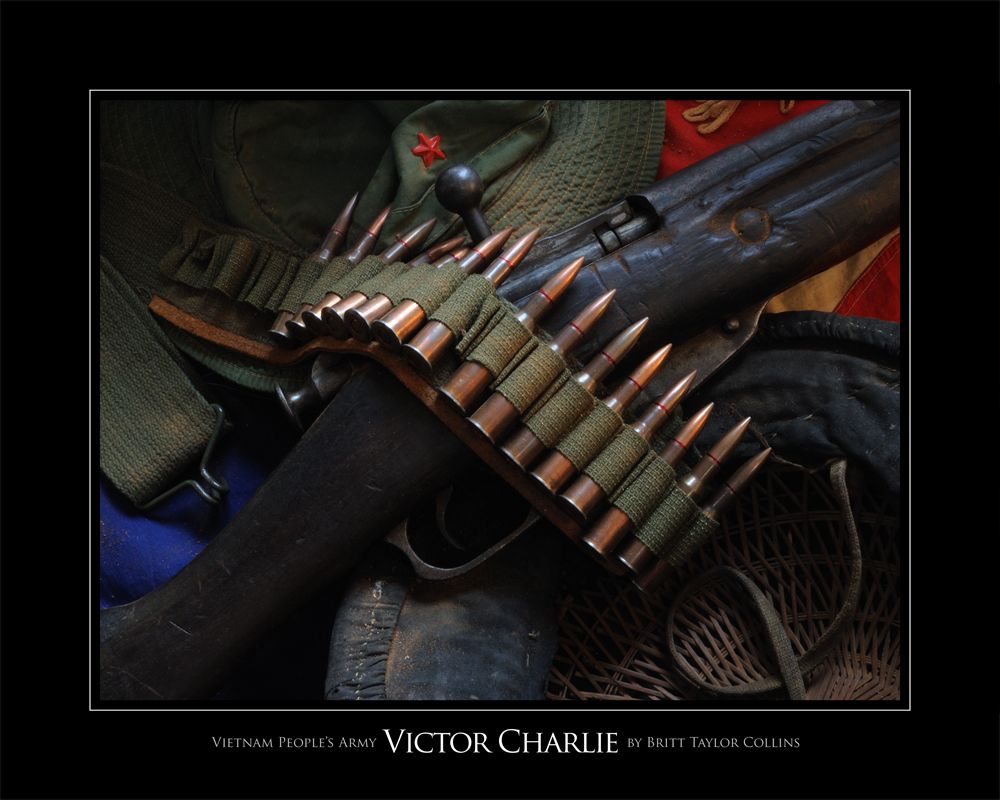 This particular piece was photographed by Britt Taylor Collins with an original Viet Cong flag, helmets, and a Mosen-Nagant 44 carbine taken off a Viet Cong irregular sniping from a spider hole in Vietnam.