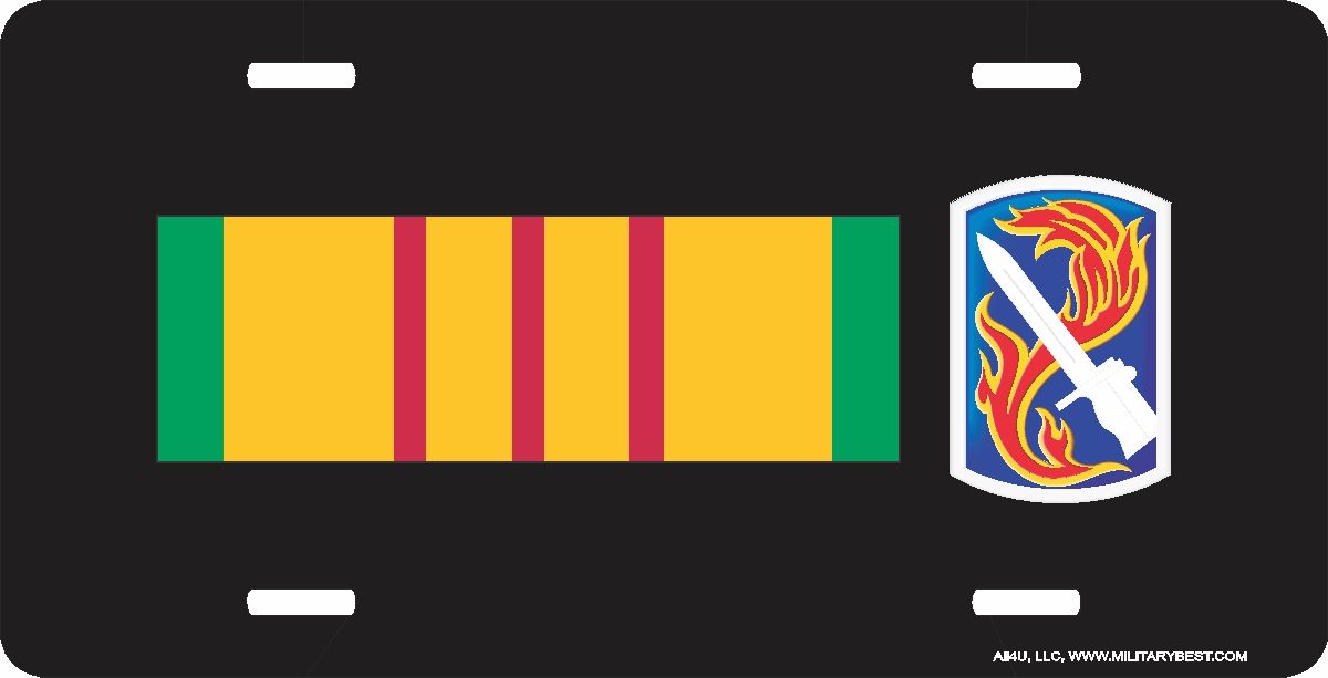 This Vietnam Ribbon with 198th Infantry Brigade License Plate is made from heavy gauge aluminum and has a baked enamel finish to last for many years of use. Each plate measures 5 15/16" x 11 15/16". This license plate would make a wonderful addition to your collection or a great gift.