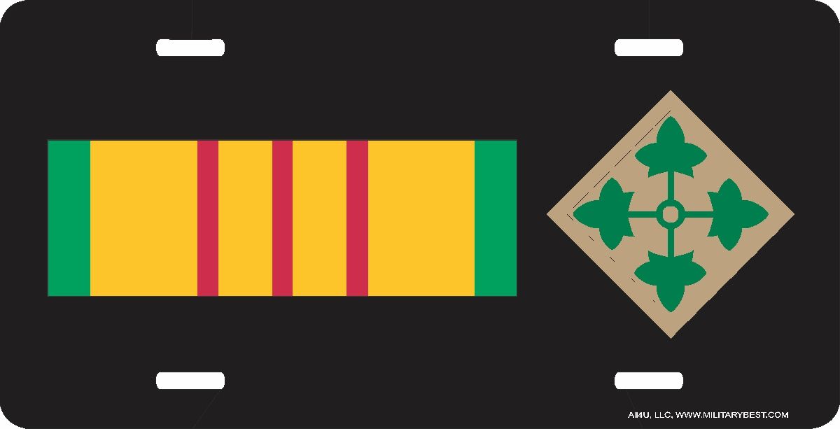 This Vietnam Ribbon with 4th Infantry License Plate is made from heavy gauge aluminum and has a baked enamel finish to last for many years of use. Each plate measures 5 15/16" x 11 15/16". This license plate would make a wonderful addition to your collection or a great gift.