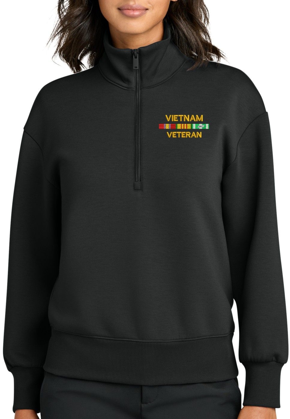 MilitaryBest is proud to offer this Vietnam Veteran with Service Ribbons Women's Soft Spacer Quarter-Zip. This quarter-zip is embroidered by our MilitaryBest team in Northeast Alabama. These quarter-zips are made using spacer yarn to provide light insulation with a soft structure, they also fight odor and provide light UV ray protection.Care Instructions: Turn Garment Inside Out. Machine Wash Cold With Like Colors. Only Non-Chlorine Bleach, When Needed. Tumble Dry Low, Remove Promptly. Cool Iron, If Necessary. Do Not Use Fabric Softeners Or Dryer Sheets.