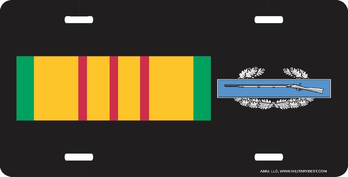This Vietnam Service Ribbon With ( CIB ) Combat Infantry Badge License Plate is made from heavy gauge aluminum and has a baked enamel finish to last for many years of use. Each plate measures 5 15/16" x 11 15/16". This license plate would make a wonderful addition to your collection or a great gift.