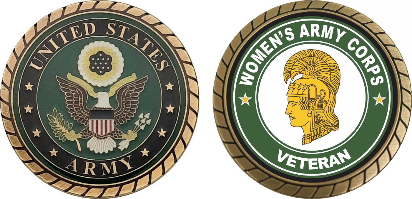 This 1 3/4” Women's Army Corps Veteran Challenge Coin is proudly offered by MilitaryBest. This Officially Licensed Army coin has beautiful enamel finish on one side and an organized crisp clean Women's Army Corps Veteran design on the opposite side.